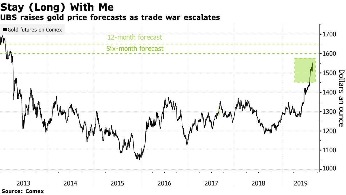 To: Rarebird who wrote (150310 ) 8/26/2019 6:36:12 AM From: TobagoJack Read Replies (1) | Respond to of 217728 Interesting that gold got beaten back by whatever this day, as Potus Trump notes team China called and wants to talk. As far as I am concerned there will always be talks, and no way can there be meaningful result, because neither side is ready to deal, w/ trump unable / willing to hold any deal together and his people not wanting any doable deal, on the one hand, and on the other, team China believing the trade war shall be long, and as prosecuted by the trump team and blessed by trump is fitting in okay w/ the team China agenda for the moment. Re specifically <<The main risk to our call is a back flip by Trump or concessions and deescalation by China, paving the way for a trade deal ahead of the U.S. presidential elections in 2020,” the UBS analysts said .>> I am relatively certain no concessions satisfying to Trump’s team would be offered, and no deescalation would hold, by team China, and Should trump back flip, kiss 2020 goodbye. It is good to have gold in respite for a few hours or days.bloomberg.com UBS Says It’s Staying Long Gold as Price Now Destined for $1,600 Ranjeetha Pakiam The dispute ‘has escalated to a new level,’ bank analysts warn Gold will extend its winning ways as the U.S.-China standoff harms growth, risking a deeper slowdown and inviting more central-bank easing, according to UBS Group AG, which jacked up price forecasts with a prediction the precious metal may hit $1,600 within three months. “The trade war between the U.S. and China has escalated to a new level,” Giovanni Staunovo and Wayne Gordon, analysts at the wealth-management unit, said in a report received on Monday. “Gold has demonstrated its safe-haven qualities and we stay long the metal, a trade we initiated in mid-May.” Gold is proving its worth as a haven this year as the two largest economies trade blows, with a significant escalation on Friday, followed by more hard-line remarks from President Donald Trump over the weekend. The Federal Reserve reduced interest rates last month as risks mounted, and some U.S. policy makers have stepped up their warnings about the outlook in recent days. After its revisions, UBS has a three-month trading range of $1,450 to $1,600 an ounce, plus a six-month forecast of $1,600 and 12-month view of $1,650. Previously, both the half-year and 12-month outlooks were set at $1,500. Futures pared gains in an abrupt move on Monday after earlier rallying as much as 1.8% to $1,565 an ounce, the highest since 2013. The shift was triggered by a comment from Trump that China now wanted to reopen talks. “The main risk to our call is a back flip by Trump or concessions and deescalation by China, paving the way for a trade deal ahead of the U.S. presidential elections in 2020,” the UBS analysts said . (Updates to add comment from report in final paragraph.)