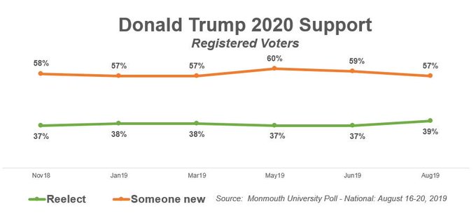 NATIONAL POLL: Reelect @realDonaldTrump in 2020 Among Registered Voters 39% support reelection 57% time for someone new