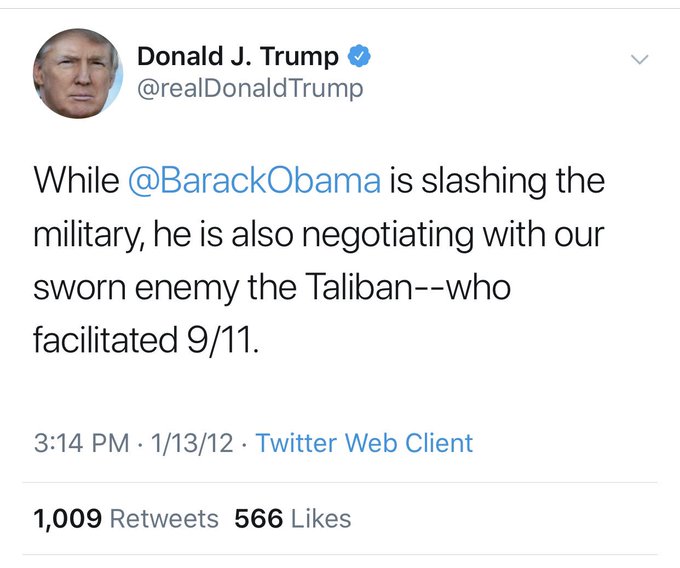 The Taliban called me, begging for a meeting. Big, tough Taliban guy. And he’s crying. Tears running down his eyes. And he says to me, “Sir, thank you for working to end the war.” But I had to say no. https://t.co/MZybcET868