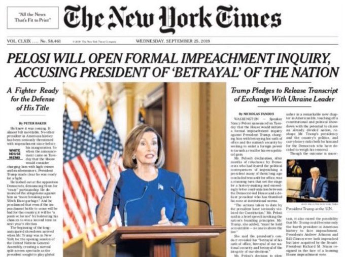 To: locogringo who wrote (1166779 ) 9/26/2019 9:09:34 AM From: sylvester80 Respond to of 1574098 OOPS! Trump Just Threw Pence Under The Bus And Now ‘President Pelosi’ Is Trending The president dragged the VP’s name into the Ukraine scandal and critics are celebrating. 09/26/2019 04:14 am ET Updated 1 hour ago By Ed Mazza huffpost.com President Donald Trump dragged Vice President Mike Pence ’s name into his growing Ukraine scandal on Wednesday. The White House released a summary of a conversation in which Trump pressured Ukrainian President Volodymyr Zelensky to investigate 2020 Democratic presidential front-runner Joe Biden and his son, Hunter Biden. But Trump said he was not the only one to speak to Zelensky. “I think you should ask for Vice President Pence’s conversation because he had a couple of conversations also,” Trump said. Trump also said he and Pence would both be exonerated, and called the vice president’s conversations with Ukraine “perfect.” Critics of the administration are now envisioning a scenario in which both Trump and Pence end up impeached. While it would take an unlikely sequence of events for that to happen, the reaction caused # PresidentPelosi to trend Wednesday night and Thursday morning, given that the speaker of the House would be next in the line of succession: Full Frontal ?@FullFrontalSamB America: Where a woman can be president but only if two men get impeached first. 36K 5:22 PM - Sep 25, 2019 Twitter Ads info and privacy 4,911 people are talking about this Jennifer Rubin ?@JRubinBlogger Replying to @RonaldKlain @RadioFreeTom Suit up, President Pelosi! 1,860 2:19 PM - Sep 25, 2019 Twitter Ads info and privacy 496 people are talking about this shauna ?@goldengateblond if this impeachment scandal takes out Trump and Pence, we won’t have to worry about the GOP anymore because all their heads will simultaneously implode during the swearing in of President Pelosi 18.5K 4:18 PM - Sep 25, 2019 Twitter Ads info and privacy 2,489 people are talking about this Franklin Leonard ?@franklinleonard If this ends with President Pelosi, I may never stop laughing. t.co Josh Dorner@JoshDorner Don't forget about Pence! He met with the Ukrainian president in Poland on September 1 and admits that they discussed "corruption" in the context of U.S. aid. We now know what corruption is code for, just like "adoptions" was code for Russian sanctions. washingtonpost.com … 16.5K 9:40 AM - Sep 25, 2019 Twitter Ads info and privacy 3,498 people are talking about this Laurence Tribe ?@tribelaw Welcome, President Pelosi? t.co PoliticusUSA@politicususa Nothing to see here. Just Trump trying to get his own vice president, Mike Pence, impeached. 17.2K 5:46 PM - Sep 25, 2019 Twitter Ads info and privacy 5,041 people are talking about this Slinky_Minky LGBTQ Ally @beckyfs22 IF I CAN’T BE PRESIDENT THEN MIKE CAN’T BE EITHER! #PresidentPelosi 827 7:59 PM - Sep 25, 2019 Twitter Ads info and privacy 166 people are talking about this Amee Vanderpool@girlsreallyrule I can't think of anything more fitting than Trump's presidency being taken away and turned over to a woman after he stole it from one. #PresidentPelosi 5,853 3:24 PM - Sep 25, 2019 Twitter Ads info and privacy 1,683 people are talking about this Nancy Sinatra ?@NancySinatra Replying to @chrislhayes He did say @SpeakerPelosi wouldn't be Speaker anymore, maybe because she will be President Pelosi. 8,288 3:52 PM - Sep 25, 2019 Twitter Ads info and privacy 1,806 people are talking about this Merida Montero @formerborgdrone #PresidentPelosi got us like... 11 8:49 PM - Sep 25, 2019 Twitter Ads info and privacy See Merida Montero 's other Tweets SeanKentComedy ?@seankent Hahahah. Mike Pence really thought if he sold out all his morals for Trump that Donny wouldn’t throw him under the bus first chance he got. #presidentpelosi t.co Kyle Griffin ?@kylegriffin1 Trump says that he thinks "you should ask for" Mike Pence's conversations with Ukraine. 1,039 3:43 PM - Sep 25, 2019 Twitter Ads info and privacy 292 people are talking about this ???????????? ????????@TheBaxterBean #DonaldTrumpsPetPeeves women who move on him like a bitch, like #PresidentPelosi 74 8:19 PM - Sep 25, 2019 Twitter Ads info and privacy 25 people are talking about this Tony Posnanski ?@tonyposnanski President Pelosi sounds real fucking good right now. 13.8K 3:26 PM - Sep 25, 2019 Twitter Ads info and privacy 2,159 people are talking about this CAHomesSeller@CAHomesSeller #PresidentPelosi @vp you may not want to get near a bus. Donny is going to throw you under it. 9 9:42 PM - Sep 25, 2019 Twitter Ads info and privacy See CAHomesSeller's other Tweets Jacob Adkins@JacobRAdkins #PresidentPelosi sure does have a nice ring to it! 16 9:09 PM - Sep 25, 2019 Twitter Ads info and privacy See Jacob Adkins's other Tweets