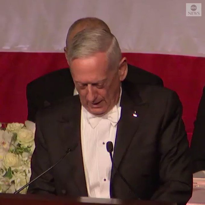 Respond to of 1573092 Former tRump's Defense Secretary James Mattis OBLITERATES POS tRump: 'I earned my spurs on the battlefield' (VIDEO) By CHRISTOPHER DONATO Oct 17, 2019, 10:14 PM ETabcnews.go.com Mary Altaffer/AP WATCHMattis roasts Trump at annual Alfred E. Smith dinner Email Former Defense Secretary James Mattis roasted his former boss at the Alfred E. Smith dinner in New York City on Thursday night. Mattis took the stage at the annual dinner -- an opportunity to crack jokes about local and national politics -- with an introduction from comic legend Martin Short. "According to the president he’s the 'most overrated general,'" Short cracked in his intro. "I think he’s an American hero." Mary Altaffer/AP Former U.S. Secretary of Defense Jim Mattis, left, Cardinal Timothy Dolan, center, and Happy Warrior Award Recipient Mary Ann Tighe react to opening remarks during the 74th Annual Alfred E. Smith Dinner, Thursday, Oct. 17, 2019, in New York. more + "I'm not just an overrated general. I’m the world’s greatest overrated general," joked Mattis, who received a standing ovation as he stepped to the dais. "I'm honored to be called that by Donald Trump, because he also called Meryl Streep an overrated actor. So I guess I’m the Meryl Streep of generals." (MORE: Top Democrats walk out of White House Syria meeting saying Trump insulted them) The rebuttal came a day after President Donald Trump called Mattis “the world’s most overrated general” during a meeting with lawmakers about the situation in Syria . Mattis had said in an interview in August that his silence about Trump was "not going to be forever.” (MORE: Silence about Trump 'not going to be forever': Former Defense Secretary James Mattis) One of the general's most biting jokes came in relation to Trump's infamous deferment of military service in Vietnam over alleged bone spurs in his feet. "I earned my spurs on the battlefield; Donald Trump earned his spurs in a letter from a doctor," Mattis said. Mattis, a retired Marine Corps four-star general, served as Trump 's first defense secretary, but resigned in December 2018 over policy differences, particularly Trump's plans to pull out American troops from Syria, writing in his resignation letter that Trump should have a defense secretary "whose views are better aligned" with his own. He joked on Thursday that his work in combat zones overseas was easier than being in Trump’s Washington. “I tried to bring some peace and order to the places with no organized government, chaotic and warring factions, irrational fears, and toxic hatred. It was hard work, but it wasn’t until I started working in Washington, D.C., that I realized how easy I had it overseas in the combat zone.” ABC News ?@ABC NEW: Former Defense Secretary Gen. James Mattis roasts Pres. Trump: "I earned my spurs on the battlefield." t.co 3,076 8:08 PM - Oct 17, 2019 Twitter Ads info and privacy 1,259 people are talking about this (MORE: 'Coherent strategy' with allies needed on Iran: Former Defense Secretary Mattis) He also knocked Trump for his many hours of executive time: “It’s been a year since I’ve left the administration, the recovery process is going well," he joked. "The counselor says I’ll graduate soon. A year according to White House time is about 9,000 hours of executive time or 1,800 holes of golf." Bloomberg via Getty Images, FILE President Donald Trump pauses while speaking as James Mattis, Secretary of Defense, listens during a Cabinet meeting at the White House in Washington, June 21, 2018. more + Mattis, who has been critical of many of Trump's foreign policy decisions since leaving office, also got serious for a moment Thursday, mentioning the U.S.'s Kurdish allies in Syria. He called for the U.S. to again back the population, which has been attacked by Turkey . "Let us restore trust in one another," Mattis said. The president was onstage in Dallas at the same time as Mattis' keynote, delivering a campaign speech to a packed crowd at American Airlines Center.