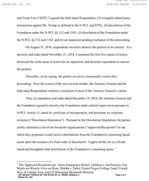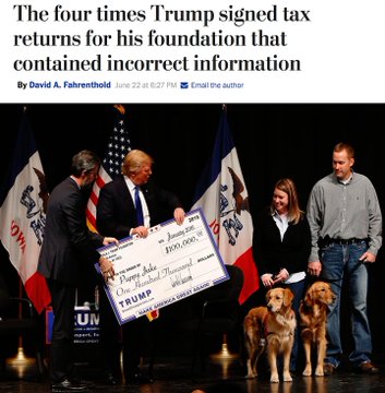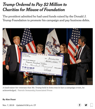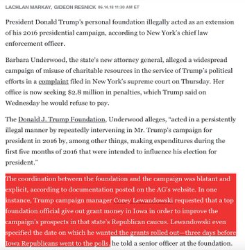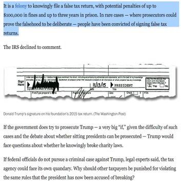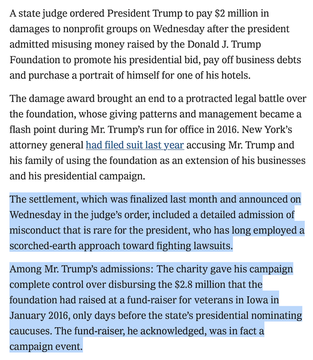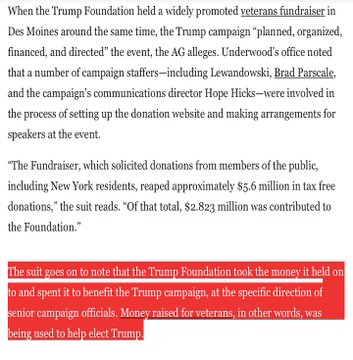 Read Replies (1) | Respond to of 1573540 Trump formally admits to felonies: BREAKING: Trump to pay $2 million to settle New York Attorney General civil lawsuit against Trump Foundation and his children, alleging "persistent" violations of charities law, including unlawful coordination with Trump's 2016 presidential campaign. Trump to pay $2 million to settle New York civil lawsuit against Trump Foundation and his childrenA New York state judge ordered President Donald Trump to pay $2 million to a collection of nonprofit organizations in connection with a settlement with the New York state attorney general's office to…https://www.cnn.com/2019/11/07/politics/trump-settlement-trump-foundation-new-york/index.html Filed in June 2018, the lawsuit alleged that Trump, Don Jr., Ivanka, and Eric violated federal and state campaign finance laws, using the Trump Foundation "as little more than a checkbook to serve Trump's business and political interests." #Maddow Unroll available on Thread Reader Polly Sigh@dcpoll BREAKING: Trump to pay $2 million to settle New York Attorney General civil lawsuit against Trump Foundation and his children, alleging "persistent" violations of charities law, including unlawful coordination with Trump's 2016 presidential campaign.https://t.co/Rmu6nq1jQT Trump to pay $2 million to settle New York civil lawsuit against Trump Foundation and his childrenA New York state judge ordered President Donald Trump to pay $2 million to a collection of nonprofit organizations in connection with a settlement with the New York state attorney general's office to... cnn.com 6,240 12:09 PM - Nov 7, 2019 Twitter Ads info and privacy 3,525 people are talking about this Background THREAD on the New York AG's lawsuit against Trump; the Trump Foundation; and Don Jr, Ivanka, and Eric, alleging their foundation engaged in “a pattern of persistent illegal conduct for more than a decade.” Unroll available on Thread Reader Polly Sigh@dcpoll Replying to @dcpoll The Trump Foundation took the money raised for veterans & spent it to benefit the campaign. "Trump's wrongful use of the Foundation to benefit his Campaign was willful & knowing.” The AG referred the allegations to the IRS & FEC for investigation. #Maddow t.co 375 1:14 PM - Jun 14, 2018 Twitter Ads info and privacy 324 people are talking about this > @NewYorkStateAG : "We’ve secured a court order forcing Trump to pay $2M in damages after admitting to illegally using the Trump Foundation to help him intervene in the 2016 election and further his own political interests. No one is above the law." ?????? Anna Massoglia ?@annalecta BREAKING: Federal judge orders Trump Foundation to pay $2 million settlement after admitting to illegally using the Trump Foundation to help him intervene in the 2016 presidential election & further his political interests. Background on the case: t.co 3,017 1:03 PM - Nov 7, 2019 Twitter Ads info and privacy 1,517 people are talking about this mentions Trump admitted to ILLEGALLY using his family's foundation to help him intervene in the 2016 presidential election and further his own political interests. And yet, he and his daughter, who was also named in the lawsuit, are still in the White House. NY AG James ?@NewYorkStateAG BREAKING: We’ve secured a court order forcing President Trump to pay $2M in damages after admitting to illegally using the Trump Foundation to help him intervene in the 2016 presidential election and further his own political interests. No one is above the law. 150K 12:57 PM - Nov 7, 2019 Twitter Ads info and privacy 46.5K people are talking about this mentions In 2007, 2012, 2013, and 2014, Trump signed tax returns for his foundation which falsely stated that none of the charity’s funds had been used to benefit him or his businesses.It's a felony to knowingly file a false tax return. Polly Sigh@dcpoll Replying to @dcpoll Trump signed tax returns for his foundation that contained FALSE information in 2007, 2012, 2013, and 2014. It's a felony to knowingly file a false tax return, with potential penalties of up to $100,000 in fines and up to three years in prison. #Maddow t.co 253 6:04 PM - Jun 22, 2018 Twitter Ads info and privacy 192 people are talking about this mentions NEW: The $2M settlement, which was finalized last month and announced on Wednesday in the judge’s order, included a detailed admission of misconduct by Trump. Trump admitted he used funds raised by the foundation to promote his campaign and pay his debts. Trump Ordered to Pay $2 Million to Charities for Misuse of FoundationThe president admitted he had used funds raised by the Donald J. Trump Foundation to promote his campaign and pay business debts.https://nyti.ms/32siD3T mentions Among Trump’s admissions: The 'charity' gave his campaign complete control of the $2.8M the foundation raised at a fund-raiser for veterans in Iowa days before the state’s caucuses. Trump admitted the 'fund raiser' was in fact a campaign event. #Maddow Unroll available on Thread Reader Polly Sigh@dcpoll Replying to @dcpoll @NewYorkStateAG NEW: The $2M settlement, which was finalized last month and announced on Wednesday in the judge’s order, included a detailed admission of misconduct by Trump. Trump admitted he used funds raised by the foundation to promote his campaign and pay his debts.https://t.co/PSS2wwpA8T 1,078 6:52 PM - Nov 7, 2019 Twitter Ads info and privacy 722 people are talking about this mentions Trump admitted to misusing money raised by his foundation to promote his presidential bid and pay off debts.Don Jr, Ivanka, and Eric, who were officers of the foundation, will undergo training to ensure they don't engage in similar improprieties. #Maddow Unroll available on Thread Reader Polly Sigh@dcpoll Replying to @dcpoll @NewYorkStateAG Among Trump’s admissions: The 'charity' gave his campaign complete control of the $2.8M the foundation raised at a fund-raiser for veterans in Iowa days before the state’s caucuses. 