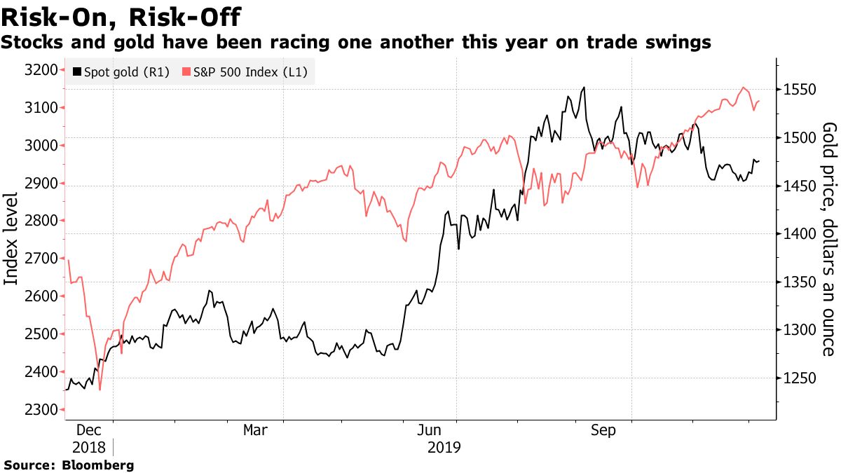While gold has been buoyed by the ongoing trade war, risk assets like U.S. equities are also finding support from optimism about a breakthrough, begging the question which one will prevail and which one is due for a pullback. Invesco Ltd.’s Kristina Hooper, who sees prospects for a 5% to 8% gain in gold next year, thinks stocks will outshine bullion.