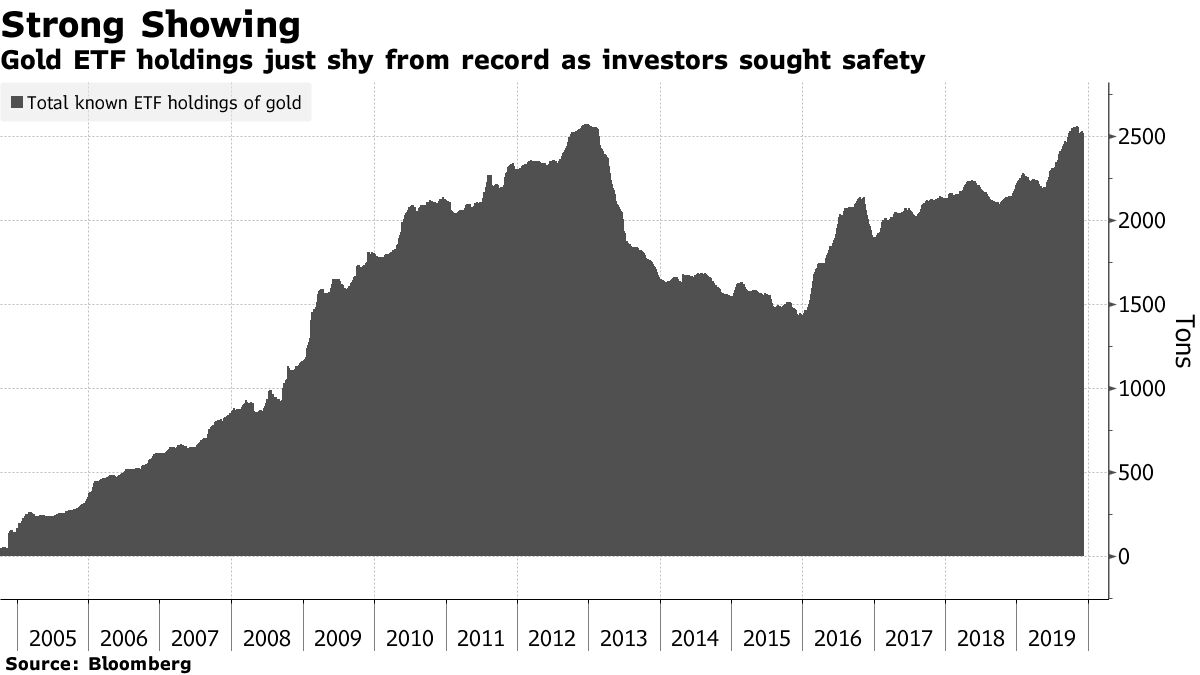 Annual AdvanceSpot gold -- which last traded at about $1,461 an ounce -- is up 14% this year, on course for the third annual gain in the past four years, with the only backward step being 2018’s 1.6% fall. In September, the metal hit $1,557.11, the highest since 2013. While holdings in bullion-backed exchange traded funds have eased, they remain near a record.