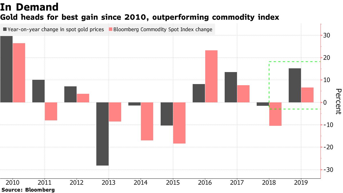 Bullion is heading for the biggest annual advance since 2010, outperforming the Bloomberg Commodity Spot Index, as a year dominated by trade war vicissitudes and a trio of Federal Reserve interest rate cuts propelled the traditional haven to the forefront. Still, with global equities remaining buoyant and the U.S. labor market proving resilient, gold’s outlook isn’t clear cut due to uncertainty over what central banks will do in 2020.