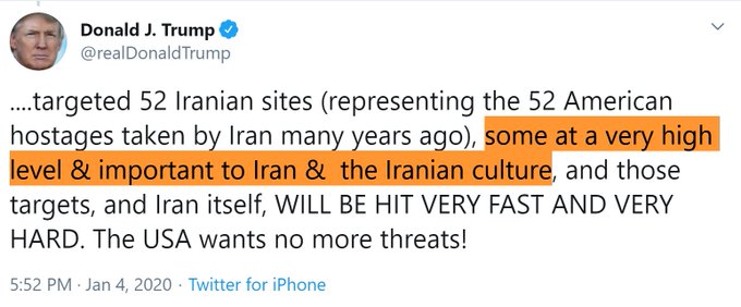 Respond to of 1574883 Twitter CEO Jack Dorsey was harshly criticized for allowing President Donald Trump to threaten to commit war crimes in Iran. Longtime political analyst Charles Johnson, the founder of the blog Little Green Footballs, blasted Dorsey after Trump threatened to attack 52 Iranian sites — including cultural targets. “What better place to make hyper-aggressive war threats than Twitter?” Johnson wrote. “These are the kinds of tweets that Twitter really SHOULD DELETE. He’s using your network to start a war, @jack,” he said, tagging the CEO’s account. “It isn’t the first time Trump has threatened Iran with war, but this is the MOST deranged and hysterical — and specific! — threat yet,” he explained. “To be fair, I don’t see anything in the Twitter Rules about starting an international conflagration in the Middle East, so maybe they’re off the hook.” “This also is far from the first time Trump has threatened to commit war crimes — which is what targeting Iranian cultural sites would be,” Johnson noted. “Trump is clearly excited by war crimes and war criminals — his often-stated goal of ‘keeping the oil’ in Iraq and other places would also be a war crime. And he pardons soldiers who commit war crimes. War crimes are his thing. He’s the war crime president.” Johnson’s thread was noticed by prominent GOP attorney George Conway, the husband of White House counselor Kellyanne Conway. He wrote Trump “is too dumb to know it’s a war crime, but also too demented to care.” Here’s what others were saying:twitter.com ........... Ryan Goodman WAR CRIME "Making the clearly-recognized historic monuments, works of art or places of worship which constitute the cultural or spiritual heritage of peoples ... the object of attack" Geneva Convention Protocol I (also: U.S. Department of Defense, Law of War Manual, 5.18) Ryan Goodman Let me put even a stronger point on this. Any U.S. officials or personnel who followed through on this statement by President Trump would be liable under the U.S. War Crimes Act, 18 U.S. Code §?2441. ................... Colin Kahl ?@ColinKahl For what it's worth, I find it hard to believe the Pentagon would provide Trump targeting options that include Iranian cultural sites. Trump may not care about the laws of war, but DoD planners and lawyers do...and targeting cultural sites is war crime. t.co ........... Jo nathan M. Katz ?@KatzOnEarth He promised to commit war crimes as a candidate. He pardoned war criminals and is making them part of his road show. He likes war crimes. t.co Tom Nichols ?@RadioFreeTom Someone better let the President know he's threatening war crimes. - 52 sites for purely symbolic reasons would be a war crime. - Striking cultural sites without military necessity would be a war crime - Striking in revenge is a war crime - Targeting civilians is a war crime ............. Susan Hennessey ?@Susan_Hennessey Well, technically, the President of the United States is *again* on record as saying "I will commit multiple war crimes." t.co Tom Nichols ?@RadioFreeTom Doesn't matter. The President of the United States is now on record as saying: "I will commit multiple war crimes." https://twitter.com/kevinp1970/status/1213610362739650561 … Susan Hennessey ?@Susan_Hennessey He campaigned on promising war crimes:rawstory.com