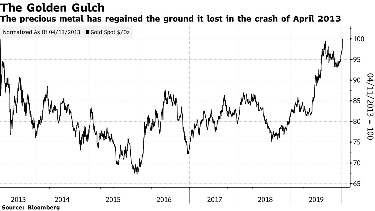 Two related landmarks were easy to miss amid Monday’s continuing excitement about the tension between Iran and the U.S., but they matter. The first was a comeback: In April 2013, gold staged a sudden and dramatic crash, dropping 13.5% in two trading days. That confirmed a bear market from which the precious metal has only just, it appears, emerged. On Monday, gold’s spot price in dollars at last exceeded its price from April 11, 2013.