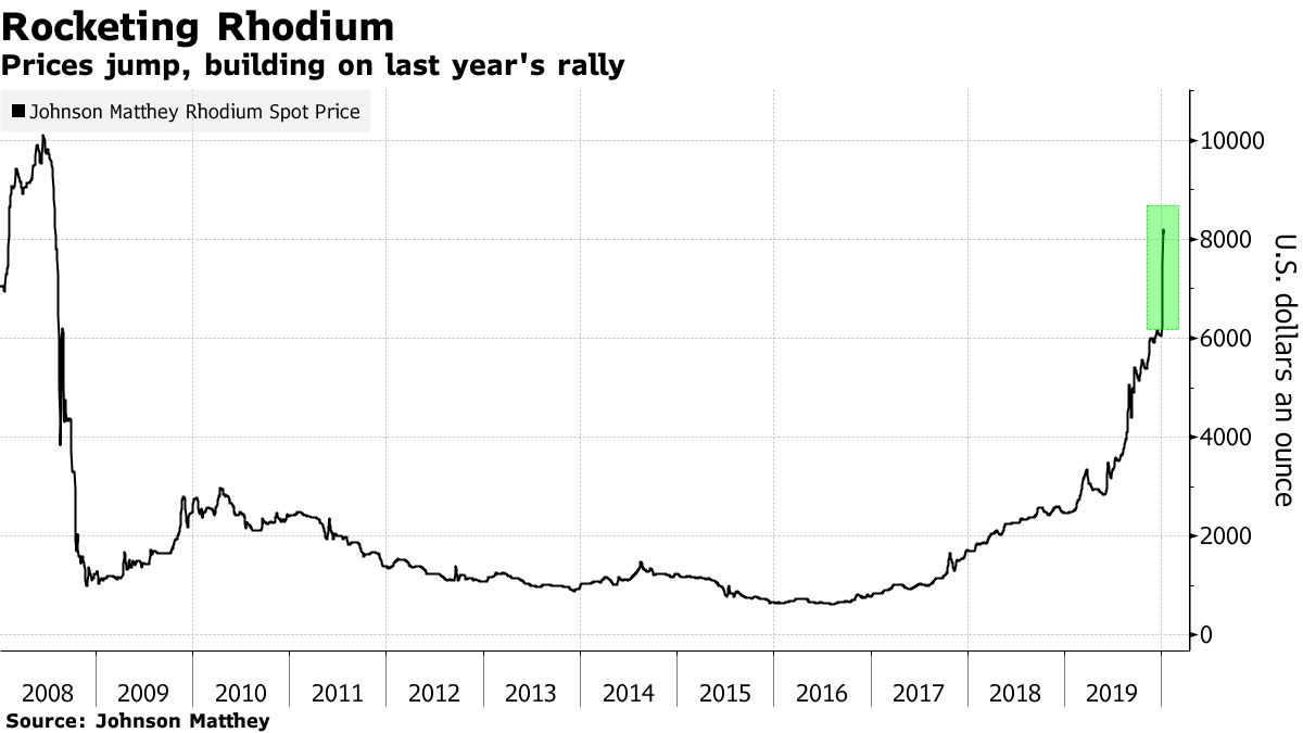 To: Horgad who wrote (152389 ) 1/12/2020 11:17:27 PM From: TobagoJack Read Replies (1) | Respond to of 218910 bloomberg.com The World’s Most Precious Metal Leaves Everything Else in the Dust Elena Mazneva 13 January 2020, 08:01 GMT+8 LISTEN TO ARTICLE Palladium ’s great start to the year pales in comparison to its lesser known, but much more expensive sister metal, rhodium. Rhodium -- mainly used in autocatalysts and five times more costly than gold -- surged 32% already this month, touching the highest since 2008. Stricter emissions rules have fueled a multiyear rally and there’s speculation that investors are also jumping in, betting that prices will climb toward a record. Rhodium rallied 12-fold in the past four years, far outperforming all major commodities, on rising demand from the auto sector. Like palladium, the metal is mined as a byproduct of platinum and nickel, but it is a much smaller market and so is liable to big price moves when supply or demand changes. “Rhodium is subject to crazy volatility,” said Anton Berlin, head of analysis and market development at Russia’s MMC Norilsk Nickel PJSC, which mines about 10% of all rhodium. Supplies are tight and speculators stepped up buying metal after large industrial users secured volumes late last year, he said. Price SurgeRhodium was at $7,975 an ounce on Friday, according to Johnson Matthey Plc. This month’s gain also came after investors turned to precious metals, seeking a haven from Middle East tensions and pushing palladium up about 9%. Best of the Best Rhodium outperformed other commodities last year Source: Bloomberg “The main driver by the beginning of January was physical demand from Asia, which might be also automotive related,” said Andreas Daniel, a trader at refiner Heraeus Holding GmbH. “Buying triggered more buying and in an unregulated market the effect was massive, with a price move which is only seen maybe every 10 years.” Although pullbacks are possible this year, rhodium could top the record $10,100 set in 2008, according to Afshin Nabavi, head of trading at refiner MKS PAMP Group in Switzerland. Still, those lofty prices a decade ago prompted autocatalyst makers to switch to platinum and palladium, which are also used for cleaning emissions. Small MarketIt’s much harder to invest in rhodium than in other precious metals. It isn’t traded on exchanges, the market for bars or coins is tiny compared with gold or silver and most deals are between suppliers and industrial users. Global production is equal to little more than a 10th of platinum or palladium output. Tiny Market Rhodium's usage is a fraction of demand for other precious metals Sources: Silver Institute, World Gold Council, Johnson Matthey NOTE: Figures show 2018 demand Mining BoostHigher rhodium prices are good news for South African producers, which account for more than 80% of global output. Gains in platinum-group metals and a weak rand helped a stock index for the nation’s miners to triple in the past year, reaching the highest since 2011. But South Africa’s dominance also means production risks hang over the market. Power shortages last year temporarily interrupted some mining operations and there have been long mine strikes in previous years by workers wanting higher pay.