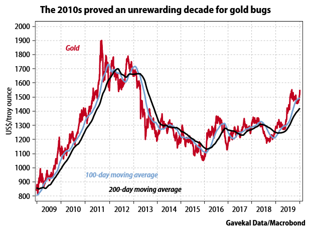 Gold: (report Jan 6, '20) has ripped higher in the last two days, climbing 3% since the killing on Friday of Iranian general Qassem Soleimani. But that price spike cannot compensate for the undeniable fact that the last 10 years have been a tough decade for the yellow metal. After a terrific 2011, the gold price mostly range-traded in 2012, collapsed in 2013, ground lower in 2014-15, then broadly range-traded again between 2016 and 2018.