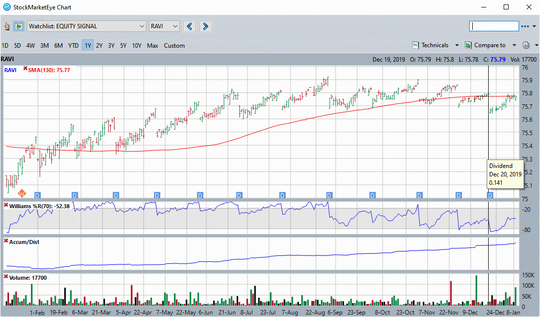 Back a few years ago when the 13 Week Treasury Coupon rate was zilch plus one penny RAVI wasn't paying enough to make it a practical alternative. Two things have happened - 1) Commission to buy/sell RAVI is now history and 2) general interest rates are higher than back then. RAVI tracked the upward climb in rates nicely and hasn't fallen back much with the more recent rate cuts. This is because of their more diversified income stream. If it was strictly treasuries and other govt paper it would have fallen back further, I believe.