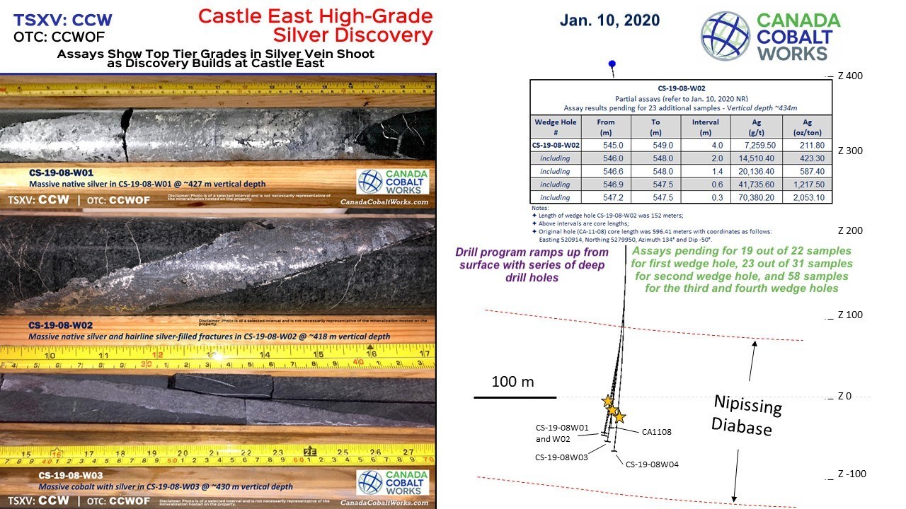 COQUITLAM, BC, Jan. 10, 2020 /CNW/ - Canada Cobalt Works Inc. (TSXV: CCW) (OTC: CCWOF) (Frankfurt: 4T9B) (the "Company" or "Canada Cobalt") is pleased to announce that assays from the second wedge hole at the Robinson Zone at Castle East, a new grassroots high-grade discovery adjacent to three past producers, have returned 70,380 g/t silver (2,053 oz/ton) over 0.30 meters within a broader zone of 1.4 meters grading 20,136 g/t (587 oz/ton) and 4 meters (core length) of 7,259 g/t (212 oz/ton).
