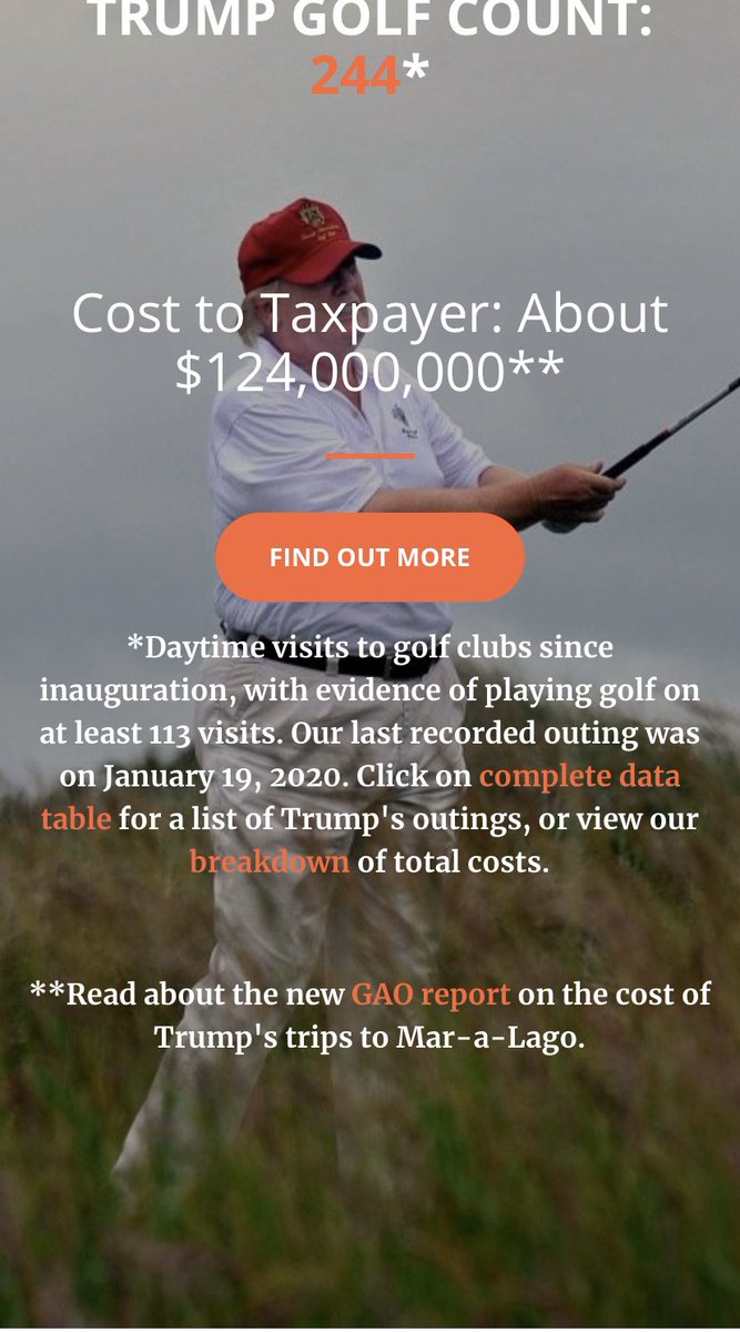 The WH refuses to disclose the exact taxpayer costs for Trump to waddle around his own golf courses ...but most estimates are approx $120 Mil. SO FAR, and on pace to hit a whopping $300 $Mil. if re-elected. An obscene amount of money that goes straight into Trump’s pocket