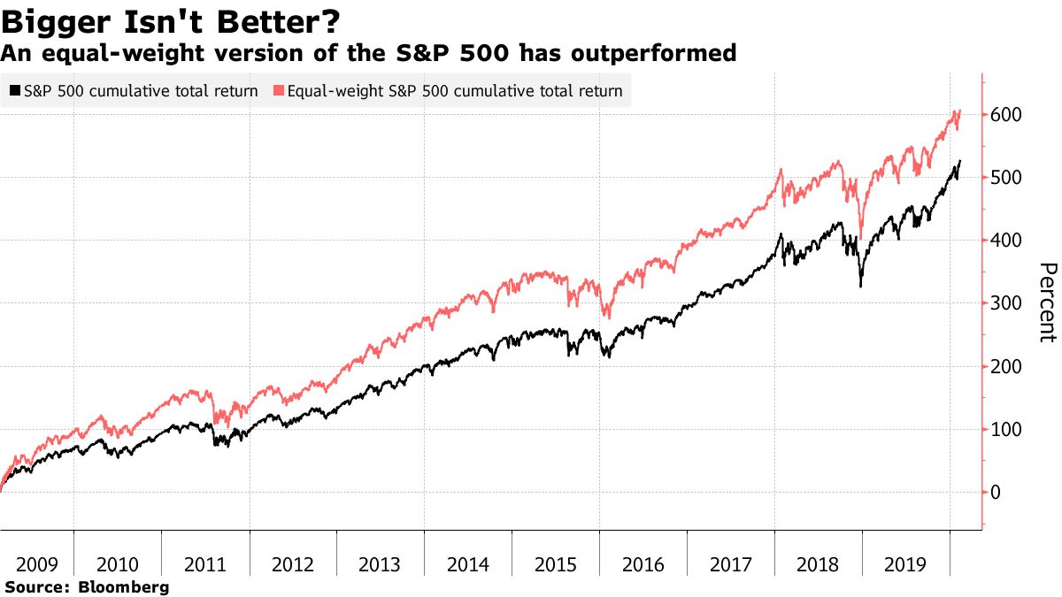 By the way, as big as the Fang stocks are, the S&P 500’s weighting methodology is not the reason for its success over the years. Since bottoming in 2009, an equal-weighted version of the benchmark has returned 605% including dividends. That’s 80 points more than the classic market-cap weighted index.