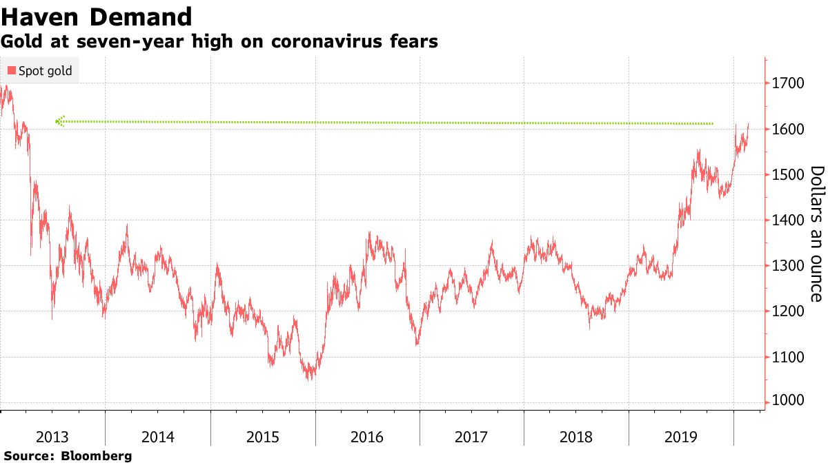 To: carranza2 who wrote (153397 ) 2/20/2020 6:37:50 AM From: TobagoJack Respond to of 217596 The consultation prize continues to rise, along w/ a bunch of other stuff. I still do not understand the message for it makes little sense given internal contradictions etc etc Unless literally governments are going to starting force-feed helicopter money to get all over the difficult stretch they see and anticipate coming to lots of placesbloomberg.com Gold Just Hit a Seven-Year High on Virus Fears Ranjeetha Pakiam February 20, 2020, 9:02 AM GMT+8 Gold traded near a seven-year high on concern that the coronavirus outbreak will retard global growth, coupled with speculation the Federal Reserve will ease monetary policy before the year-end. Palladium held near a record after building on a powerful rally. Bullion has risen at a time U.S. stocks are at an all-time high even as traders weigh the disease’s impact. While Hubei, the center of the outbreak, reported fewer new cases after another revision, there are signs of deepening economic damage. In addition, two deaths were reported in Iran and two people from a quarantined ship in Japan died, highlighting the threat outside China . The traditional haven has climbed 6% this year amid mounting concern over the effects of the virus, with companies from Apple Inc. to Burberry Group Plc cutting guidance. While minutes from the latest Fed meeting showed that officials indicated they could leave rates unchanged for many months, futures traders maintained expectations for at least one cut over 2020. “Support for the yellow metal is driven by economic uncertainty related to the coronavirus – i.e. how long could the pandemic last and what will its ultimate impact be on world economic growth?” Gavin Wendt, senior resource analyst at MineLife Pty in Sydney, said in an email. “Importantly, we’ve seen gold performing strongly in a range of currencies, hitting new all-time highs during 2019 and 2020,” said Wendt. That reflects not only investor uncertainty, but also a likelihood more stimulus will be required, including lower rates, to boost activity in a post-coronavirus world, he said. Spot gold traded at $1,607.95 an ounce at 3:02 p.m. in Shanghai, down from Wednesday’s peak of $1,612.98, which was the highest since March 2013. Holdings in global exchange-traded funds backed by bullion have risen to a record, and are on course for a sixth weekly expansion. Prices may top $1,650 over the coming weeks, according to UBS Group AG’s Global Wealth Management unit, which says it remains long on the precious metal. “With U.S. equity valuations elevated, any further upsets could see another bout of volatility, a further rally in government bonds and a higher gold price,” analysts Wayne Gordon and Giovanni Staunovo wrote in a report dated Feb. 19. Palladium climbed 0.3% to $2,725.22 an ounce. The metal used to curb emissions from vehicles touched an all-time high of $2,849.61 on Wednesday on concerns over a widening global deficit, and as the Chinese government pledged to stabilize car demand in the country. Among other main precious metals, silver fell 0.7%, while platinum fell 1.3%.— With assistance by Martin Ritchie