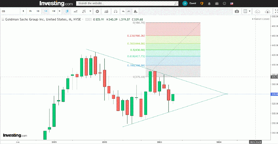 GS - With earnings out tomorrow pre-market, now is a good time to analyze what's driving this bellwether. Pretty straightforward symmetrical triangle as seen below. Of course, I believe the breakout will be up, and if it happens this month (above 375), the stock should be seeking the top of the retracement tool for its breakout target. 486 anyone? Oh yeah!! After 486, Look out below!!