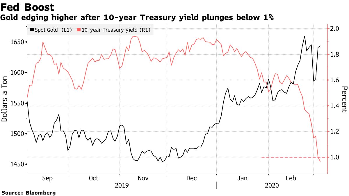 To: carranza2 who wrote (153872 ) 3/3/2020 10:31:46 PM From: TobagoJack Respond to of 218907 the suspect msm would have us believe gold was handed a win, when all it has done is recover lost ground the miners doing same but without conviction that should have been undergirded by leverage but good that the fall has stopped, for at least now, a consolation, allowing us to play the rest of the market w/ peace of mind, so can play better investment we are not doing captaining a boat, yesbloomberg.com Gold Handed a Win With Powell’s Cut Hammering Treasury YieldsGold just got a powerful boost from the Federal Reserve, with bullion extending gains in Asia after the U.S. central bank’s emergency, virus-driven rate cut set off a collapse in 10-year Treasury yields to an all-time low. Bullion prospers from low rates, and more easing is expected from the Fed and other central banks as policy makers seek to blunt the economic fallout from the health crisis. Money markets point to the Bank of Canada jumping into action next with a cut expected its scheduled meeting later Wednesday. Gold has surged more than 8% so far this year on sustained haven demand, with prices hitting a seven-year high as holdings in bullion-backed exchange-traded funds expanded to a record. Fed policy makers shaved 50 basis points off their benchmark, cutting rates outside the normal cycle of meetings for the first time since 2008 . The Fed’s easing, including debt purchases, contributed to a decade-long rally in bullion that sent prices to a record in 2011. “Central-bank actions are aiding gold appreciation,” said Chris Weston, head of research at Pepperstone Group in Melbourne, Australia. “The Fed are worried, and so the equity market feeds off Powell’s sentiment, which is supporting gold,” he said, referring to Fed Chairman Jerome Powell. Gold jumped as much as 0.7% to $1,652.67 an ounce, and traded at $1,643.67 at 11:09 a.m. in Singapore following Tuesday’s 3.2% surge. The Fed’s latest move is helping to reinvigorate demand after bullion plunged on Friday, with investors selling the metal to cover losses in other asset classes. The S&P 500 Index ended almost 3% lower on Tuesday following the Fed’s cut, as well as comments from Powell that the outbreak will weigh on activity “for some time,” and a joint call between leading finance ministers. The 10-year Treasury yield plunged below 1% to a record low, while the dollar fell. Gold-backed ETFs saw more inflows on Tuesday, with the total expanding to the most ever. There was an influx 15.6 tons, the most in tonnage terms since mid-January, according to a preliminary tally compiled by Bloomberg News. On the virus front, Vice President Mike Pence -- who’s leading the U.S. response -- said that 13 states now have coronavirus cases. Infections also rose in South Korea and Iran, where more officials were diagnosed.— With assistance by Jake Lloyd-Smith, Justina Vasquez, Ranjeetha Pakiam, and Martin Ritchie Before it's here, it's on the Bloomberg Terminal. LEARN MORE