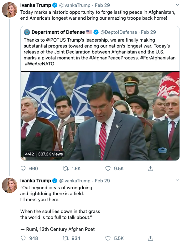 Ivanka telling the Taliban that there is a place beyond rightness or wrongness, and one day we will meet there in blissful ecstasy, is one of the great moments of the Trump administration