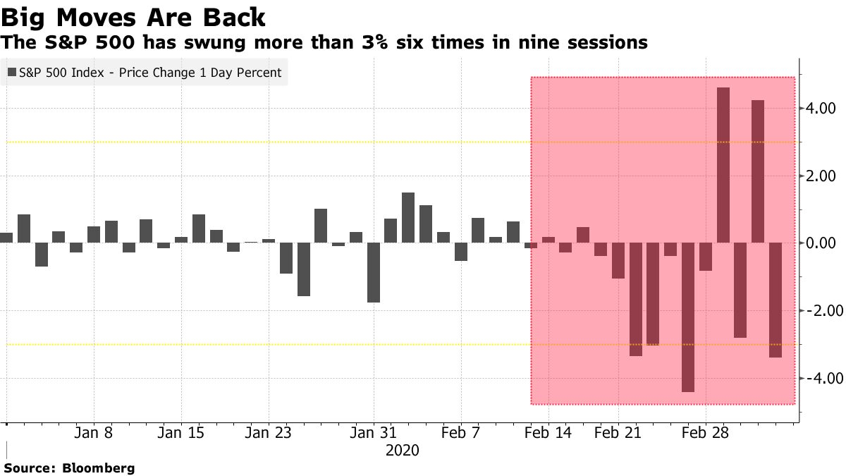 Gains on Monday turned to losses Tuesday turned to gains Wednesday turned to losses Thursday. In nine trading sessions, three have seen the S&P 500 close up or down 4%, and four others brought 3% dives. An eight-day average of the S&P’s daily high-low range is the widest since 2011, according to Bloomberg data.