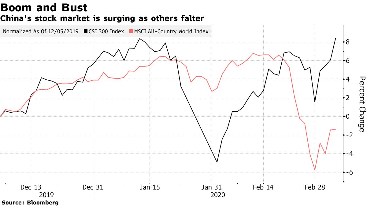 To: Pogeu Mahone who wrote (153942 ) 3/5/2020 8:52:15 AM From: TobagoJack Read Replies (1) | Respond to of 218913 :0) always time for another wagerbloomberg.com China Traders Are Making Easy Money While Rest of World Panics Global markets in turmoil. Central banks rushing to arrest panic. But in China, the country most affected by the virus outbreak, it’s boom time for traders. A gauge of stocks in Shanghai and Shenzhen has jumped 14% in just over a month to close at a two-year high on Thursday. One exchange-traded fund focused on 5G amassed $2 billion in days as investors clamored to chase a rally in tech shares. Seeking to maximize returns, punters have driven stock leverage and daily turnover past 1 trillion yuan ($142 billion), both near four-year highs. Government bonds have surged too, with the 10-year yield approaching its lowest level since 2002. It’s a sharp turnaround from just a month ago, when the virus darkened factories across the nation, whole cities were isolated under quarantine and the stock market was hit by the most savage selling in years. The swift response from the Communist Party to arrest the spread of the deadly disease helped restore confidence as the number of new infections outside of the worst-hit province of Hubei drop. A succession of policy-easing measures ensured liquidity was ample in markets, with a measure of interbank borrowing costs tumbling to its lowest level in almost a decade. Another impetus for the rally: the prospect of massive fiscal stimulus similar to that unleashed in the wake of the global financial crisis. The result is an explosion of speculative trading by Chinese investors hooked on greed at a time when global equity markets are imploding and fear is rampant. That’s helped Shanghai’s equity benchmark become this week’s top performing in the world. For more on China’s markets: Such a disconnect by China’s still largely insulated markets isn’t unusual. A stock bubble in 2015 existed in isolation to the rest of the world before bursting violently, which global peers mostly shrugged off. “Chinese equities provide a hedge against the recent volatility in global risk assets,” Eugenia Victorino, head of Asia strategy at SEB AB, wrote in a note Thursday. “We continue to believe in the resilience in Chinese equities in the near term.” She recommends a long position in Chinese equity futures, targeting another 16% rally. Still, the contrast to the rest of the world is glaring, especially given the potentially devastating impact of the virus to an economy already struggling under a mountain of debt and weakened by the trade war with the U.S. Factory activity contracted by the most on record in February and economists continue to lower their China growth forecasts. Private enterprise faces a rising debt bill and an increase in defaults is likely this year. Just last week the government took over once-acquisitive HNA Group Co. after the contagion hurt the firm’s ability to meet debt obligations. Yet, for now, investors have faith in the government to navigate this crisis like it has others in recent decades. China’s army of about 160 million retail traders are a formidable force when momentum starts to take off, as seen by a rush into new mutual stock funds as well as ETFs. As China’s markets continue to defy gravity, the rest of the world can only look on with wonder -- or fear that it could all come crashing down.— With assistance by Amanda Wang, Amy Li, and Jeanny Yu