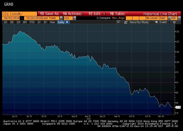Respond to of 206184 Last time Oil Took A Dive Oil Takes A Dive: Great For U.S. Consumers, Terrible For Russia And Venezuela For Americans, cheap oil means less money spent each time you fill up on gas, and more to spend on everything else. But in countries depending on oil revenues, oil's plunge is bad news. Matthew ZeitlinBuzzFeed News Reporter Posted on December 1, 2014 , at 3:04 p.m. ET Oil prices had been dropping precipitiously going into last Thursday's meeting of the Organization of Petroleum Exporting Countries, the oil cartel that accounts for about 60% of global oil exports. Heinz-Peter Bader / Reuters OPEC Secretary-General Abdullah al-Badri arrives for a news conference after a meeting of OPEC oil ministers at OPEC's headquarters. Since hitting a high of almost $116 in June, the price of Brent Crude fell below $80 in the middle of November, its lowest level in four years. Bloomberg After the organization decided to maintain its production target at 30 million barrels a day, oil prices dropped even further, with the price of Brent Crude dropping from $77.55 a barrel on Thursday to $70 on Friday. It bounced back to $73.32 today.The price for West Texas Intermediate (WTI) crude — a benchmark for oil produced in the U.S. — is even lower, around $69 per barrel. Bloomberg ADVERTISEMENT In the U.S., this long slide in oil prices means consumers have more to spend, as less money gets sucked out of the country through gas purchases and more expensive shipped and manufactured goods."The general rule is that each penny decline in gasoline prices adds a little more than $1 billion to consumers' discretionary income," according to Citigroup. The national average price of regular gas today is $2.77, compared to $3.00 a month ago and $3.27 a year ago, according to AAA. The 70-cent drop in three months has tacked on 0.7% more overall consumer spending across the country, according to Citi. Mike Blake / Reuters Even though production of oil in the U.S. has nearly doubled in just the last five years — helping drive a big run-up in the oil supply that has dragged down the price — the U.S. trade deficit in oil is about 1% of its gross domestic product, according to Deutsche Bank. Mike Blake / Reuters But for American companies that drill for oil, the drop in oil prices meant falling stock prices. ExxonMobil's stock is down 2.7% since before the Thursday meeting, while Chevron's is down 4.4% Bloomberg The big drop — and likely low prices going forward — has hammered countries that are dependent on oil revenues, especially Venezuela and Russia, which have to spend more than Gulf states like Saudi Arabia to get oil out of the ground. Ria Novosti/Reuters Carlos Garcia Rawlins/Reuters Russian President Vladimir Putin and Venezuelan President Nicolas Maduro Citi estimates that Russia needs oil priced at $107 for its oil revenues to balance government spending, while Venezuela needs $161 per barrel. Ilya Naymushin / Reuters A general view shows the Achinsk oil refining factory, owned by the Rosneft company, outside the town of Achinsk, Russia. Saudi Arabia, on the other hand, has a break-even oil price of $98 a barrel. Heinz-Peter Bader / Reuters Saudi Arabia's Oil Minister Ali al-Naimi Russia' currency, the ruble, continued its long slide against the dollar. After spiking 54 roubles for every dollar, it settled at 51.65. In June, one dollar bought 33.7 roubles. Bloomberg The ruble's devaluation is bad news for Russian consumers, wreaking havoc on the prices of imported goods including, most importantly, food. Bonds issued by Venezuela's state oil company were yielding more than 20% today, meaning that they were cheaper and investors had less faith they would get paid back. Twenty-five percent of the country's gross domestic product comes from oil and gas. Bloomberg The 10-year yield on bonds sold by Venezuela's state oil company Stock in Rosneft, the massive state-controlled Russian oil company, is down over 11% since Thursday. Bloomberg ADVERTISEMENT One outlet, however, didn't see much to worry about in the ruble's slide. Via rt.com Question More. TOPICS IN THIS ARTICLE Russia Matthew Zeitlin is a business reporter for BuzzFeed News and is based in New York. Zeitlin reports on Wall Street and big banks. Contact Matthew Zeitlin at matt.zeitlin@buzzfeed.com . Got a confidential tip? Submit it here .