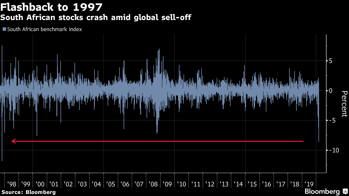 South Africa’s benchmark stock index plunged the most since the market crash of October 1997 as reaction to U.S. measures aimed at curbing the spread of the coronavirus accelerated the sell-off sweeping through global equities.