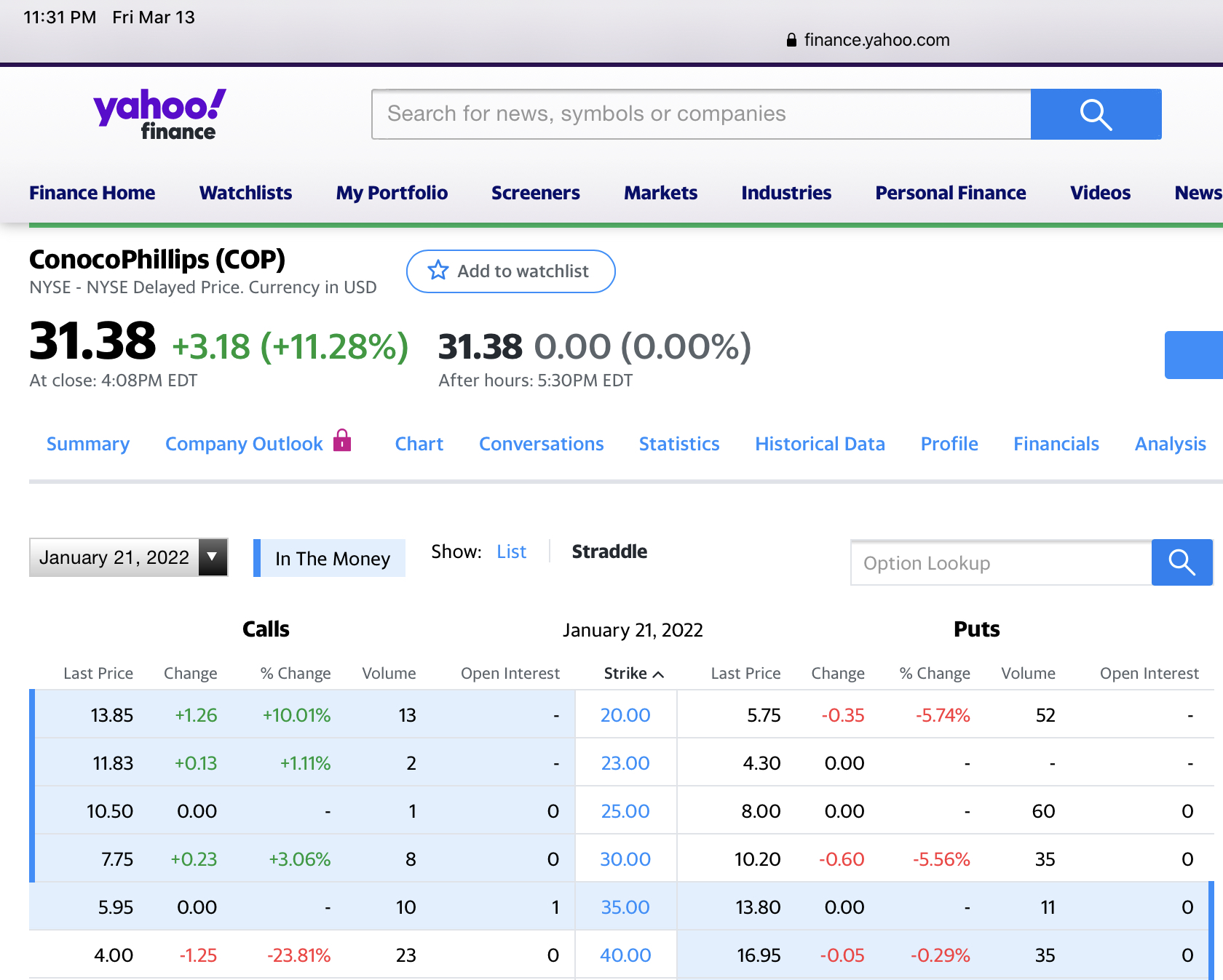 The market is broken and crazy, allowing COP to be picked up at 50% off if done in combo w/ shorted at-money put/call, and offering 5.96% yield on equity, so offering 12% on the combo package.