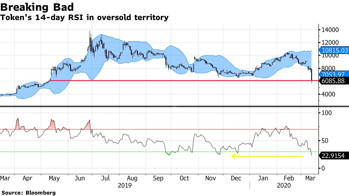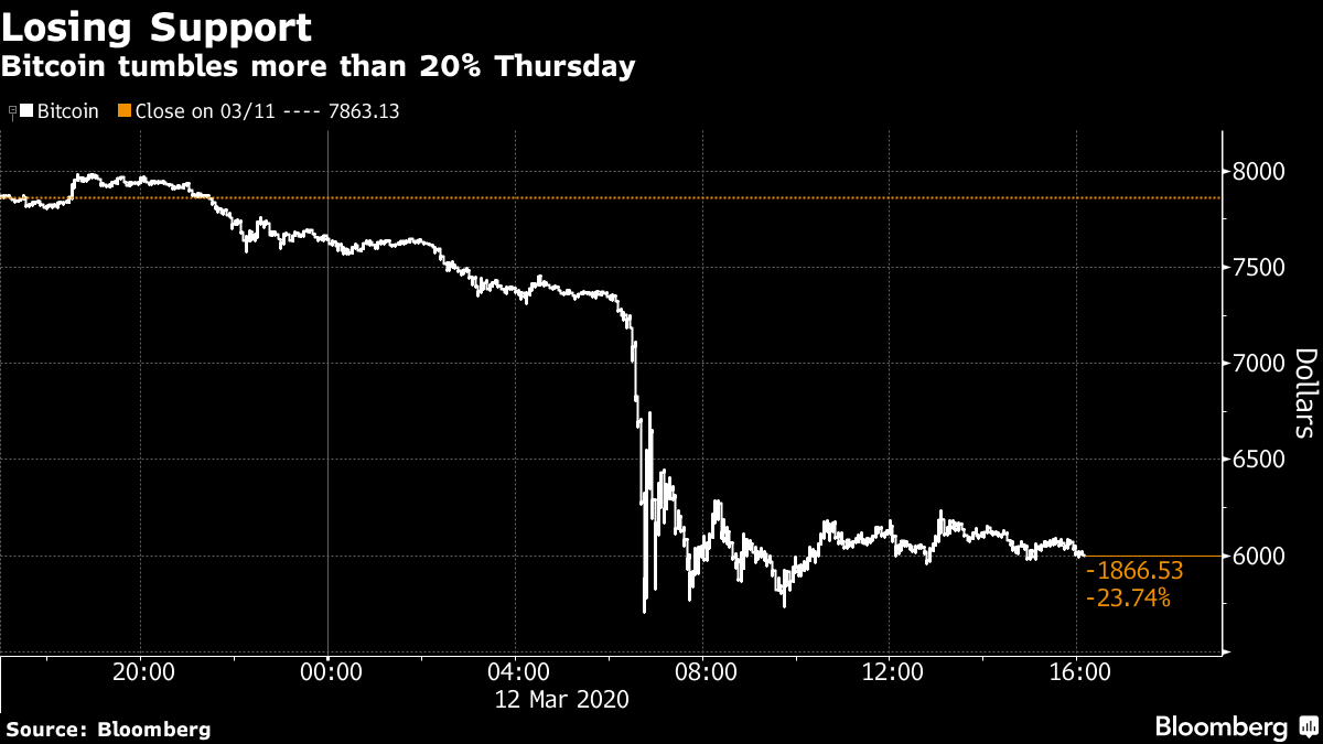 To: bull_dozer who wrote (154395 ) 3/15/2020 5:27:13 AM From: TobagoJack Respond to of 218043 I guess we got an interim conclusion w/r whether crypto or gold better havenbloomberg.com Bitcoin Plunges Through $6,000 in Worsening Crypto Rout Eric Lam Other major cryptocurrencies post even steeper declinesFollow Bloomberg on Telegram for all the investment news and analysis you need. Bitcoin plunged on Thursday, at one point sinking through $6,000 for the first time since May as a sell-off in cryptocurrencies became a rout amid wider market turmoil sparked by the coronavirus pandemic. The largest digital currency at one point tumbled 27% to $5,705.31, though the drop eased slightly for it to trade down 24% at $6,013 as of 4:07 p.m. in New York, according to Bloomberg pricing. That’s the largest single-day drop since December 2013. The wider Bloomberg Galaxy Crypto Index slumped 26%, with Ether, XRP and Litecoin also plunging. The wild moves come as stock gauges globally slide into bear markets and credit cracks on fears the spreading virus will cause a significant economic downturn. The retreat threatens to undermine the argument from many of its advocates that Bitcoin can be a haven in times of turmoil. Bitcoin’s Wild Ride “Investors are moving out of any risky assets,” said Vijay Ayyar, Singapore-based head of business development at crypto exchange Luno. “Even though Bitcoin is compared to gold as a safe haven asset, it’s very under-penetrated and is considered more as a risky asset to hold at this point.” Bitcoin's Tumble Shows It's No Haven WATCH: The cryptocurrency is plunging alongside equities as more stock markets slide into bear territory. Here’s what other market-watchers are saying: Ashish Singhal, chief executive officer of CRUXPay : “Crypto prices are once again riding on the same panic wave as that of stock markets, which are the worst we have seen in a long time. Amid WHO declaring Coronavirus as a pandemic, the global oil price war, and Trump suspending travel from Europe to the U.S., the world economy is taking a huge blow, and crypto seems to have been caught in this whirlwind.” Technical indicators point to support around the $6,000 level, though the 14-day Relative Strength Index (RSI) broke below 22 to its lowest level since September. Assets are considered oversoldif the RSI falls below 30. In addition, the token also broke through the Trading Envelope’s lower limit, which could portend a relief rally to the mean as has happened following similar previous occurrences. The indicator smooths moving averages to map out higher and lower limits. “The crypto markets are affected right now because BTC has been trading like it’s positively correlated with the equities market,” said Jonathan Leong, co-founder and CEO of BTSE, a financial technology firm. “If you compare the traditional markets to the BTC market cap of $140 billion it is difficult to consider Bitcoin as a safe haven at this time”— With assistance by Sam Potter, and Kenneth Sexton