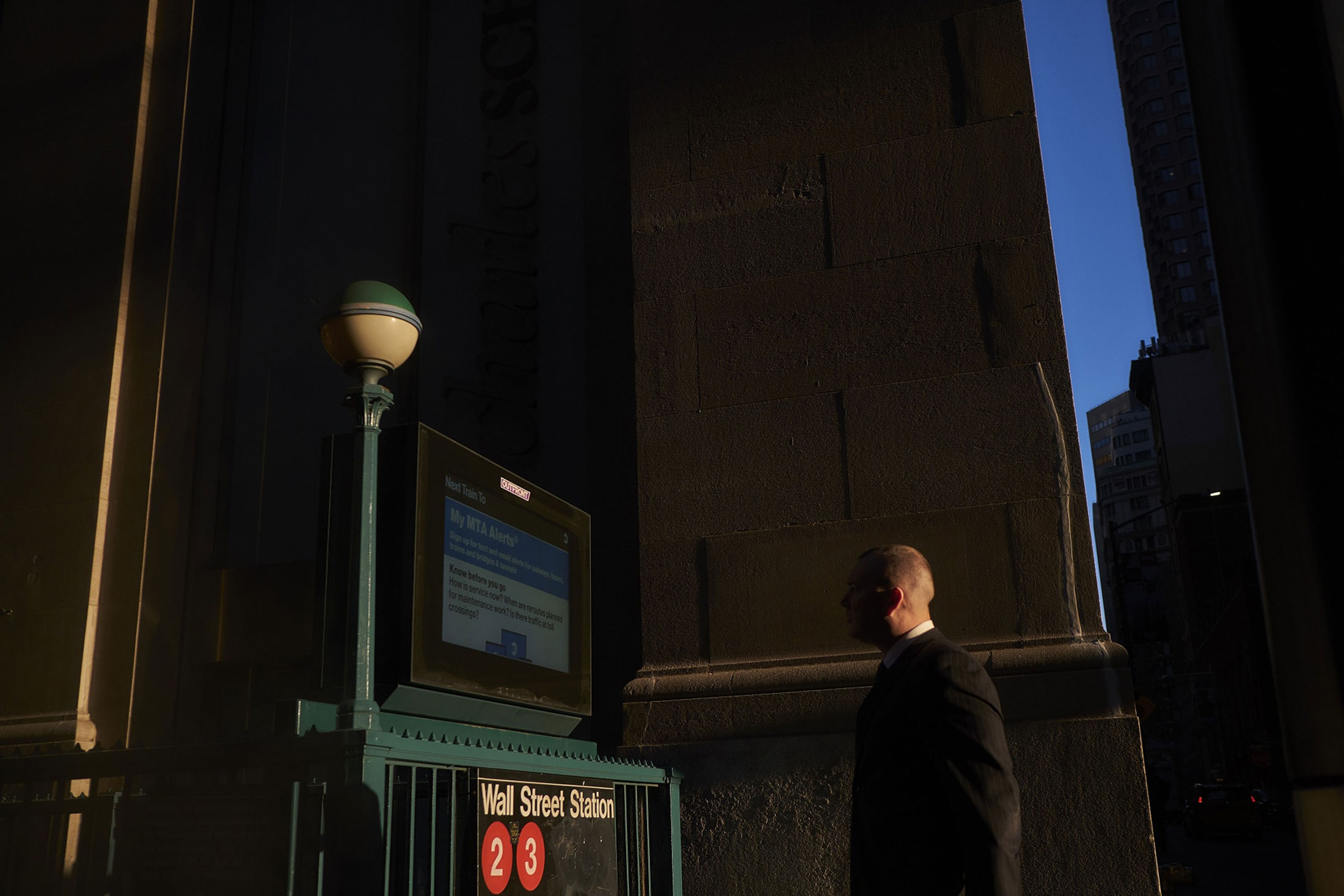 A pedestrian approaches a subway station near the New York Stock Exchange.