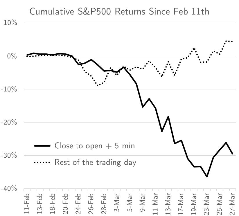 If you had bought stocks at 9:35 a.m. each day and sold them at the close, you’d be up a little bit over the past month and a half. If you bought them at the close and sold them at 9:35 a.m., you’d be down about 30%.
