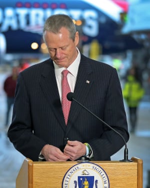 Massachusetts governor Charlie Baker speaks to the press on Thursday in front of a plane that delivered masks from China. Photograph: Jim Davis/EPAUS states have found themselves competing against each other and the federal government for equipment. The New York governor, Andrew Cuomo, said this week that it was like “being on eBay with 50 other states”.