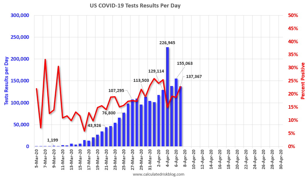 I'm becoming visibly sick at the sheer incompetence of our response. As far as testing goes, Calculated Risk thinks we need to be doing somewhere between 300K and 800K/day. Not counting California's golden spike, we're doing 140K.