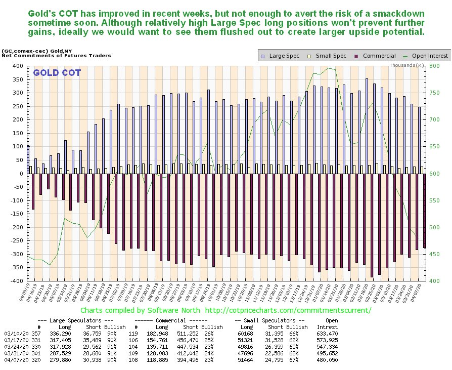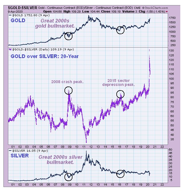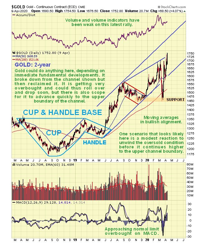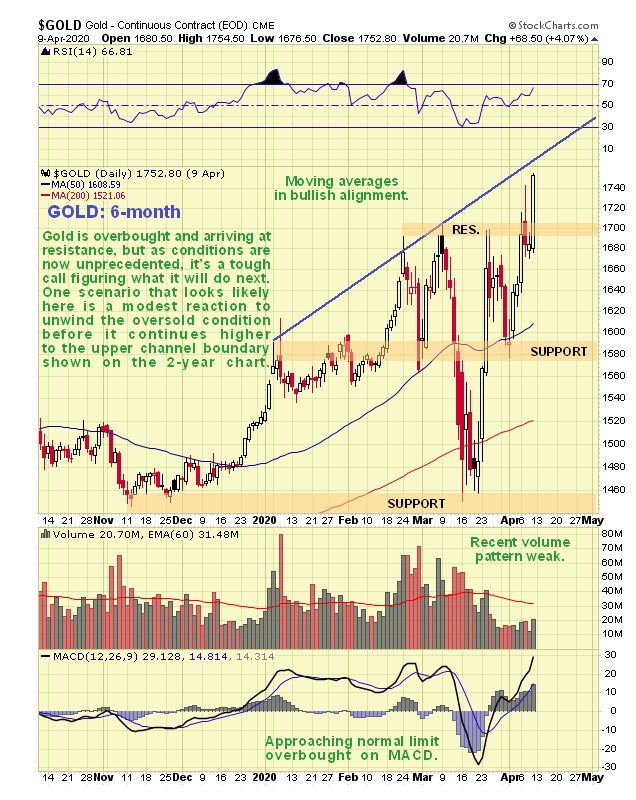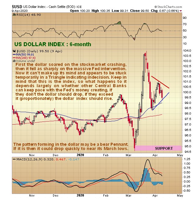 Thus we have the Fed pumping money into Wall St to bid stocks back up, and also taking it upon itself to backstop every aspect of the debt market. The amounts of fiat created for this purpose in recent weeks have been staggering, eclipsing by many orders of magnitude anything done in 2008, which was a “walk in the park” compared to what is going on now. As discussed in yesterday’s article Welcome to the HYPERINFLATIONARY DEPRESSION one of the core reasons for the nationwide lockdown, using the Covid-19 virus as the excuse, is to pulverize privately owned small businesses across the nation and then absorb their assets, their business and their manpower, both to eliminate competition with larger Fed backed corporations, and to curtail the political independence that goes with private ownership. The economic deep freeze required to bring this about will obviously involve heavy costs, but the Fed has the answer to that which is create still more money with the ultimate being borne by society at large via rampant inflation, once the velocity of money finally picks up again. Needless to say, the astounding amounts of money being spirited into existence to achieve all this, promise rampant inflation heading in the direction of hyperinflation, which must be bullish for assets having intrinsic value, like gold and silver. It is therefore logical and reasonable to expect a humongous bullmarket in the Precious Metals that will dwarf all previous bullmarkets, which is what the extraordinary extremes in the gold / silver ratio have been promising for a long time. The big challenge for us is to determine how gold and silver will perform over the short to medium-term, until the velocity of money picks up and hyperinflation kicks in, given that the powers that be, knowing the allure of gold and silver for the ordinary investor trying to preserve his wealth, will not pass up any opportunity to put the boot into them whenever they can, which they usually attempt when trading in the metals is light as it switches from Asia to Europe. Last week many of our technical indicators were pointing to weakness soon in gold and silver, but then the Fed made it plain late in the week that they were going to backstop the entire debt market. This dragged the dollar down and gave the Precious Metals a boost and they closed out the week strong going into the Easter holiday. We will start our roundup of the charts as usual with the latest 6-month gold chart on which we see that, after being held in check by resistance near $1700 most of the week, news of the latest Fed profligacy caused it to break clear above this level with a big $68 gain on Thursday. However, the volume profile remains weak, it is getting very overbought now on its MACD and it is approaching a potential trendline target currently at about $1760 - $1765, so, just going on this chart, it could reverse soon, perhaps after a little more upside. However, the 2-year chart gives us a higher possible target for this move. The reasons for the seemingly bizarre action in gold since early March are actually logical, at least they are viewed in hindsight. In early to mid-March markets were crashing with the specter of a deflationary bust taking gold and silver down too, as happened in 2008 before the bailouts. Then the Fed came riding to the rescue in spectacular fashion, this time making it clear that there were no limits to the funds they are prepared to throw at the markets to goose them higher. Naturally, because of the inflationary implications of this, gold and silver then recovered along with the stockmarkets, despite the fact that the economy is dead with zero velocity of money – for now – to drive inflation up. So what happened is that gold broke down by a big margin from the uptrend in force from early last year, but then climbed all the way back up into it – a most unusual development brought about by most unusual circumstances. Because last week’s extraordinary actions by the Fed promise eventual hyperinflation, the long-term outlook for gold could not be more positive. However, it remains vulnerable to being smashed down again at again until the velocity of money picks up, which will be the prelude to this hyperinflation, which is what makes forecasting its movements over the short to medium-term so tricky. As we can see on this chart, it is now free to make a run at the upper boundary of the uptrend, but as it is already so overbought, one scenario that looks probable is that it pauses here and maybe reacts back some, before then advancing further, although as we have already observed, the 6-month chart suggests that it may have hit a target for now and could go into a deeper reaction. What happens now depends on fundamental developments which is very unpredictable in the current fluid and unstable environment. Whilst gold’s latest COT shows continued modest improvement, it also makes clear that it would take a quite heavy drop over the short to medium-term to clean this COT up and flush out the Large Specs and create a better foundation for sustained advance. Turning to the 6-month chart for the dollar, we see that after a dramatic spike on the crashing stockmarket, it then plunged back on the heavy Fed intervention, and is now stuck temporarily in a Triangle marking indecision. If anything, this Triangle looks like a bear Pennant which implies another sharp drop soon, and if that happens, gold and silver are going up. Lastly we will take another look at the long-term chart for the gold / silver ratio, which is at an all-time record, strongly suggesting that a major gold and silver bullmarket is incubating, and as pointed out above, we can expect it to really gain traction when the velocity of money starts to pick up… |