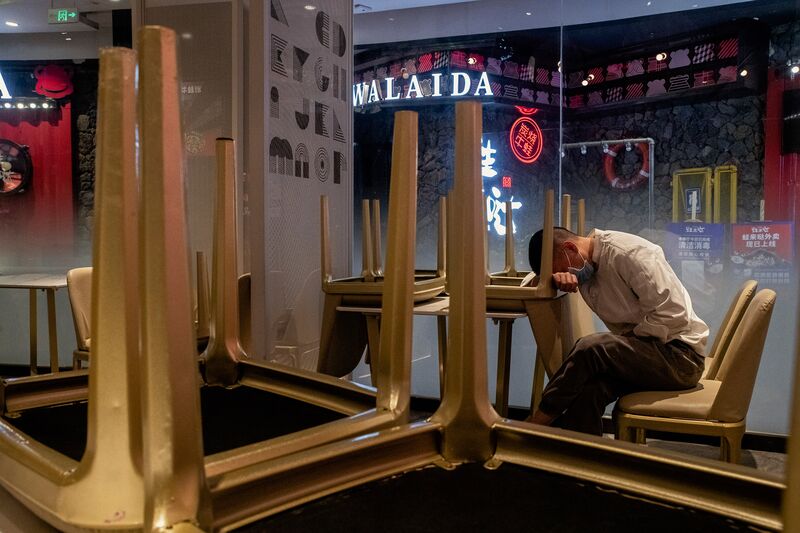 A cook takes a nap. Because of the pandemic, the restaurant operates only for food delivery. PHOTOGRAPHER: GILLES SABRIE FOR BLOOMBERG BUSINESSWEEK Of the 10 restaurants Xiong’s company, Bainianfeng Catering Management Co., operated before the outbreak, none have reopened for dining in. And while three have resumed making food deliveries, Xiong has already decided to shutter three other locations for good because he expects fewer customers. Now the 40-year-old entrepreneur and his business partners are trying to decide what to do long term. Half of Bainianfeng’s restaurants were hotpot joints, where groups of diners cook raw meat and vegetables in communal pots of boiling broth—the sort of places customers now are likely to avoid. “There will be a significant downturn in consumption,” Xiong says, predicting the city’s hospitality scene will see a shakeout.