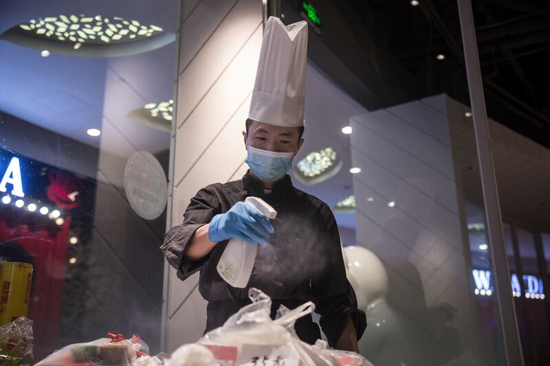 A chef sprays alcohol on packaged food. PHOTOGRAPHER: BLOOMBERG As the quarantine began, Bainianfeng, like restaurateurs from New York to Sydney, sought refuge in meal deliveries. But Wuhan had turned into a ghost town overnight, and Xiong had to figure out how to source and transport ingredients that grew more expensive as supplies ran low. Meanwhile, his staff—greatly reduced because most were too scared to report to work or restricted from leaving their housing compounds—spent much of their time sanitizing the kitchen of the one restaurant he managed to keep open during lockdown.