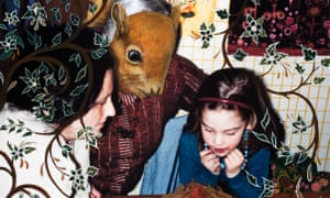A 2009 piece by Johnson paints over an image of her grandmother smiling as she balances her two grandchildren in her lap. Photograph: William Eakin Art became Johnson’s means of processing her family’s painful history; a 2009 series uses a squirrel to represent her grandmother at times, after Orlikow once said the LSD injections made her feel like a squirrel trapped in a cage. A 2016 video installation shows Johnson, wearing a mask made from an old photo of her grandmother, trying to prepare a meal. “The doctor took her apart and put her back together so it’s an impossible task,” said Johnson.