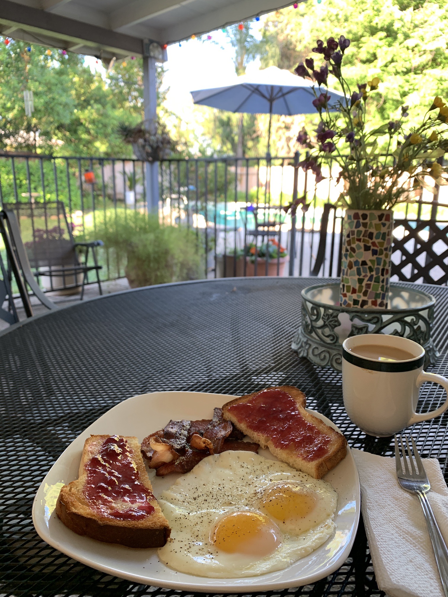 Today's breakfast of bacon and eggs was acompanied by toast with pomegranite jelly (both the bread and the jelly made by my wife)