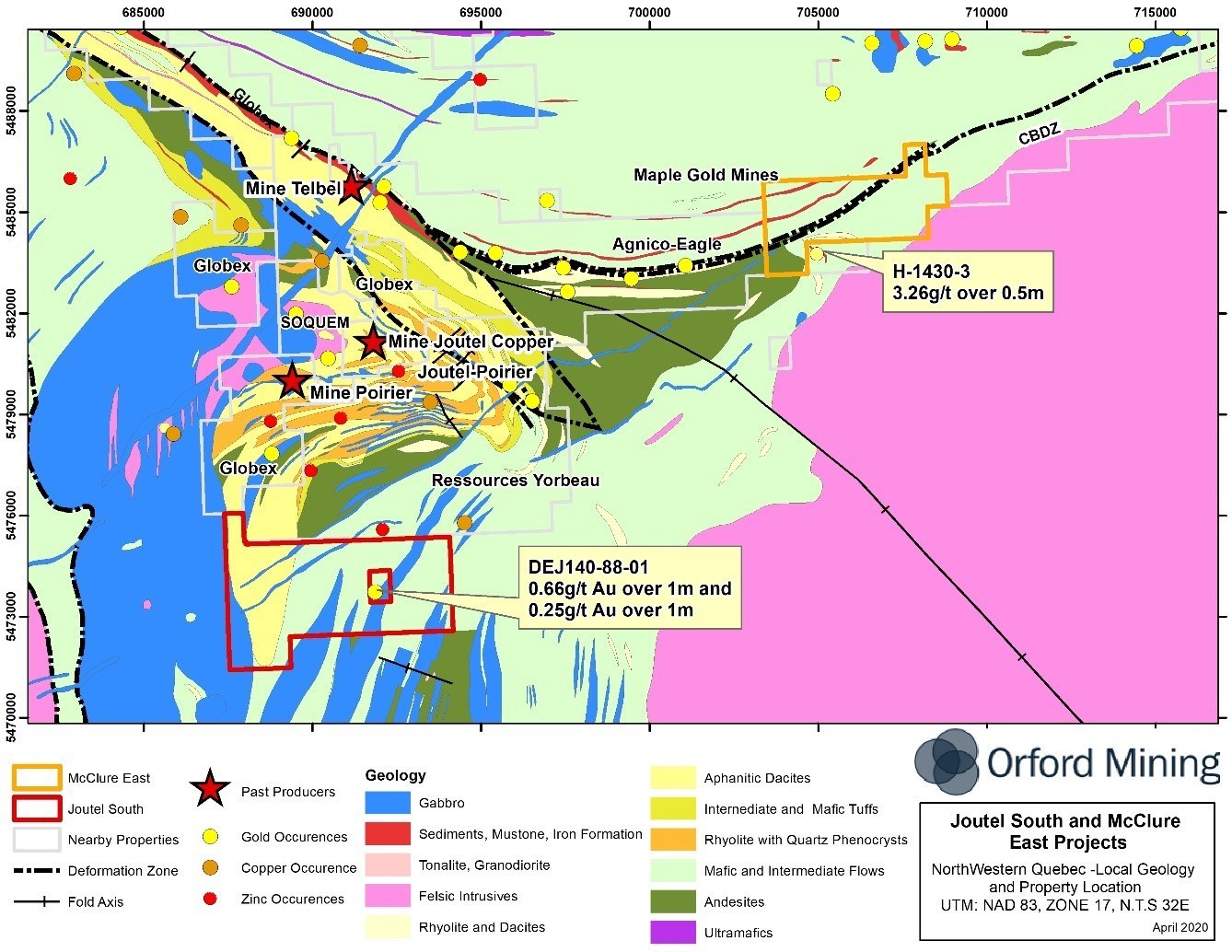 Figure 2: Local Geology of the Joutel South and McClure East Properties(6) TORONTO, April 29, 2020 /CNW/ - Orford Mining Corporation ("Orford") (TSX-V: ORM) is pleased to announce that it has acquired by staking two claim blocks along the prolific gold mineralized Casa Berardi /Joutel Structures, in the Abitibi region of Northern Quebec. One claim block "Joutel South" is at the southern underexplored extension of the Joutel trend that hosted both Agnico-Eagle Mines Ltd.'s (AEM-T) founding gold mine Eagle/Telbel which produced in excess of 1.1Moz of gold1 and a number of copper assets that have produced 244 Mlbs of copper, 116Mlbs of Zinc and 52Mlbs of silver2, all on neighbouring properties. All commercial operations in the region had closed by 1993. The other block is on the easterly extension of the Casa Berardi structural zone, which to the west hosts Hecla Mining Ltd's (HL-NYSE) Casa Berardi Mine which has produced 2 million oz and has reserves of 3.4 million ounces3, and the nearby Duay Gold Deposit held by Maple Gold Mines (MGM-TSXV) containing 422,000 oz in indicated and 2,532,000 oz in inferred resources4, both on neighbouring properties. This information from neighbouring properties is not necessarily indicative of the mineralization on Orford Mining's properties.