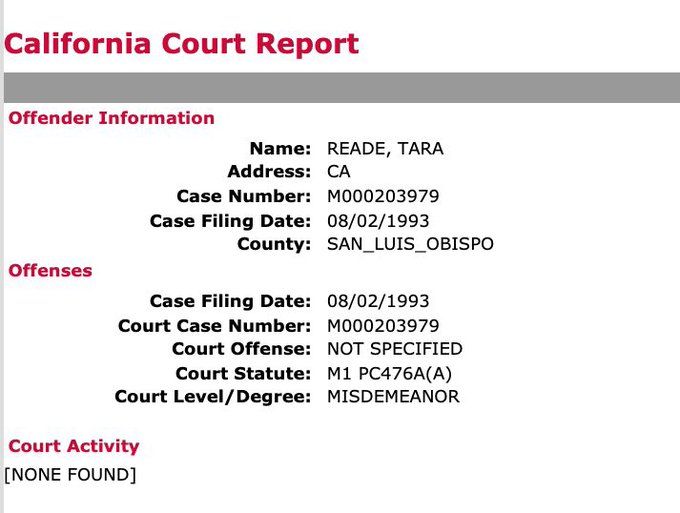 Tara Reade arrested for passing hot checks Aug 2, 1993, four days before she leaves Biden's staff.