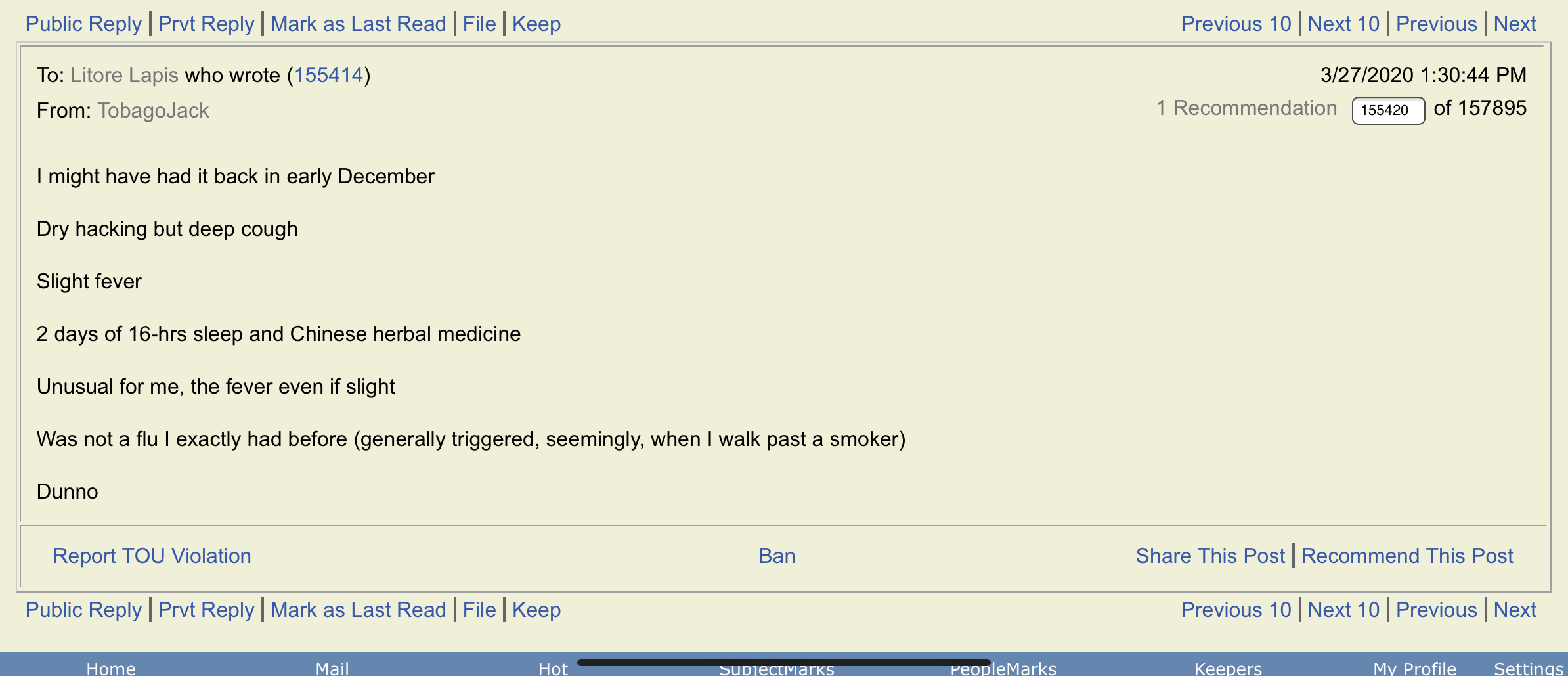However, as earlier noted, I may an expert by another means Message 32637555 and if so, the virus is survivable though best fight back early. My son had a slight cough. My daughter may have had a slight cough. My 89-years young mom was and has been perfectly fine. No one else I know had any symptoms as far as I know. Just do not know. Am asking my assistant to get tested for antibody, but as she is healthy, might take awhile in the normal course of events.