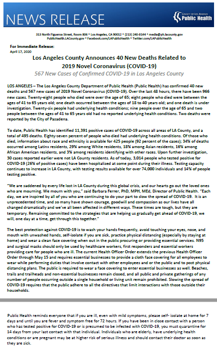 @lapublichealth Announces 40 New Deaths Related to #COVID19 and 567 New Cases of Confirmed COVID-19 in Los Angeles County. 11,391 Positive Cases of COVID-19 Across All Areas of LA County and a Total of 495 Deaths. View bit.ly for more.