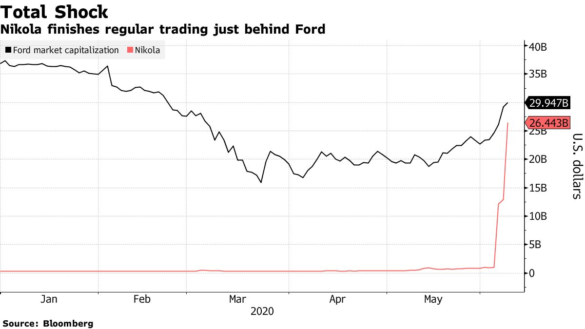 To: carranza2 who wrote (158881 ) 6/9/2020 9:16:01 AM From: TobagoJack Respond to of 218163 Dunno. Watching. Implied volatility is between 150-300% depending on expiration, meaning enough lemon to safely juice.bloomberg.com A $26 Billion Truck Company With Zero Revenue Just Surged 103% Edward Ludlow LISTEN TO ARTICLE Tesla Inc. shares are at an all-time high. Hertz Global Holdings Inc. ’s are well above where they were before the company went bankrupt. But no stock in the automotive sector is a better indication of equity-market exuberance than Nikola Corp. The aspiring battery-electric and hydrogen fuel-cell truck maker debuted on the Nasdaq last week following a reverse merger with a blank-check company headed by a former General Motors Co. executive and board director. It’s forecasting zero revenue for 2020 and its first $1 billion year won’t be until 2023. Ford Motor Co. , by comparison, is expected to report about $115 billion of revenue for this year. And yet Nikola, whose stock more than doubled Monday, traded up another 24% to as high as $90.71 in early trading Tuesday, giving the company a richer market capitalization than the almost 117-year-old maker of the F-150. Skeptics have long questioned the market’s valuation of Tesla, which has yet to post an annual profit. But by pushing Nikola’s market cap to $26 billion at Monday’s close, investors have taken appraisals of zero-emission vehicle manufacturers named after a celebrated Serbian-American inventor to another stratosphere. “Nikola’s No. 1 goal is stable growth over time,” Trevor Milton, Nikola’s executive chairman, said in an emailed statement. The 38-year-old said several factors could be behind the stock’s gain and cited examples including his tweeted announcement that the company will start taking reservations for its Badger pickup. Starting five years ago, when Milton founded Nikola, through the end of last year, the Phoenix-based company has lost about $188.5 million . It’s planning to start delivering the Tre battery-electric semi truck next year, followed by two fuel cell-electric models in 2023. The Badger model that Milton said may have gotten the market excited on Monday might not actually make it into production. In Nikola’s public-offering filing, the company said it is focused on making Class 8 heavy-duty vehicles and doesn’t expect to build the Badger unless it finds an established manufacturer to partner with. A spokesperson for the company said Nikola will announce a partner in the near future, without giving more specifics. Last week, Milton ceded the chief executive officer job to Mark Russell, a former COO of metals manufacturer Worthington Industries Inc. who has been president of Nikola since February 2019. VectoIQ Acquisition Corp., the company Nikola merged with, is led by Steve Girsky, a former GM vice chairman who helped lead the carmaker out of bankruptcy. Little Cash Nikola had about $86 million in cash at the end of last year. Prior to the stock listing, it had raised more than $500 million of private capital, though that includes a $150 million in-kind contribution from CNH Industrial NV , the truck maker linked to Italy’s billionaire Agnelli family. CNH also invested $100 million cash in Nikola last year. The partnership with CNH includes a 50-50 venture in Europe that aims to start producing battery-electric trucks in Germany in the first half of next year and a North American alliance that Nikola will fully own. Nikola is planning to build a 1-million-square-foot facility south of Phoenix and start making trucks in 2021. It’s expecting to reach full production of about 30,000 fuel cell-electric vehicles in 2027 and 15,000 battery-electric vehicles the following year. Slow-Going Sales Nikola sets conservative targets and timeline for volume from U.S. plant Source: Nikola's April 6 analyst day presentation Note: Company provided forecasts for first three years and projections for years when it expects each vehicle type to reach full production. Although Nikola touts reservations for 14,000 fuel cell-electric trucks that it says are worth about $10 billion of sales, those are far from done deals. The company told prospective investors in April that it was negotiating with strategic fleet partners to convert pre-orders into binding contracts with deposits. While times are good for Milton -- his fortune now stands at $9 billion , according to the Bloomberg Billionaires Index -- he still covets something Tesla’s CEO Elon Musk has: a blue check mark on Twitter. Then again, Milton may want to be careful about seeking notoriety on Musk’s favorite social-media platform. The account @TESLACharts, which has accumulated roughly 26,400 followers by incessantly trolling Musk, has taken notice of Nikola’s rise. (Updates with early Tuesday trading in the third paragraph.) Before it's here, it's on the Bloomberg Terminal. LEARN MORE Sent from my iPad