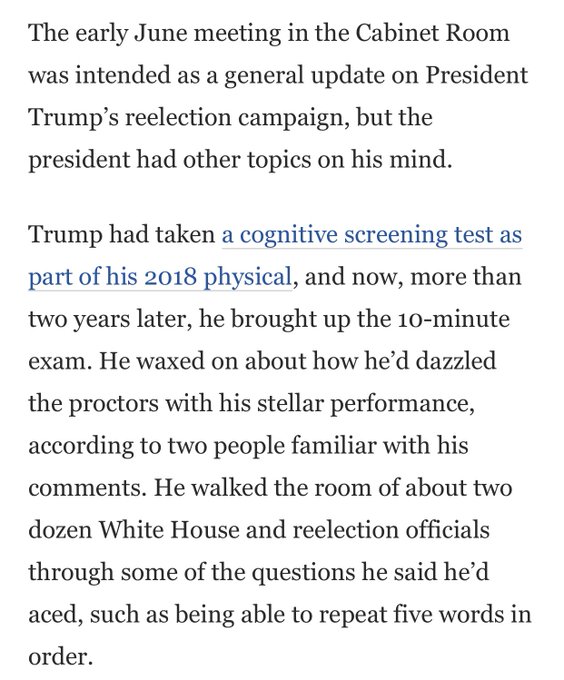 In a White House meeting, Trump — unprompted — suddenly began waxing on about a cognitive test he took in 2018, boasting about how well he’d done, and how he’d been able to repeat five words in order. Then, he challenged Biden to take the same test. t.co