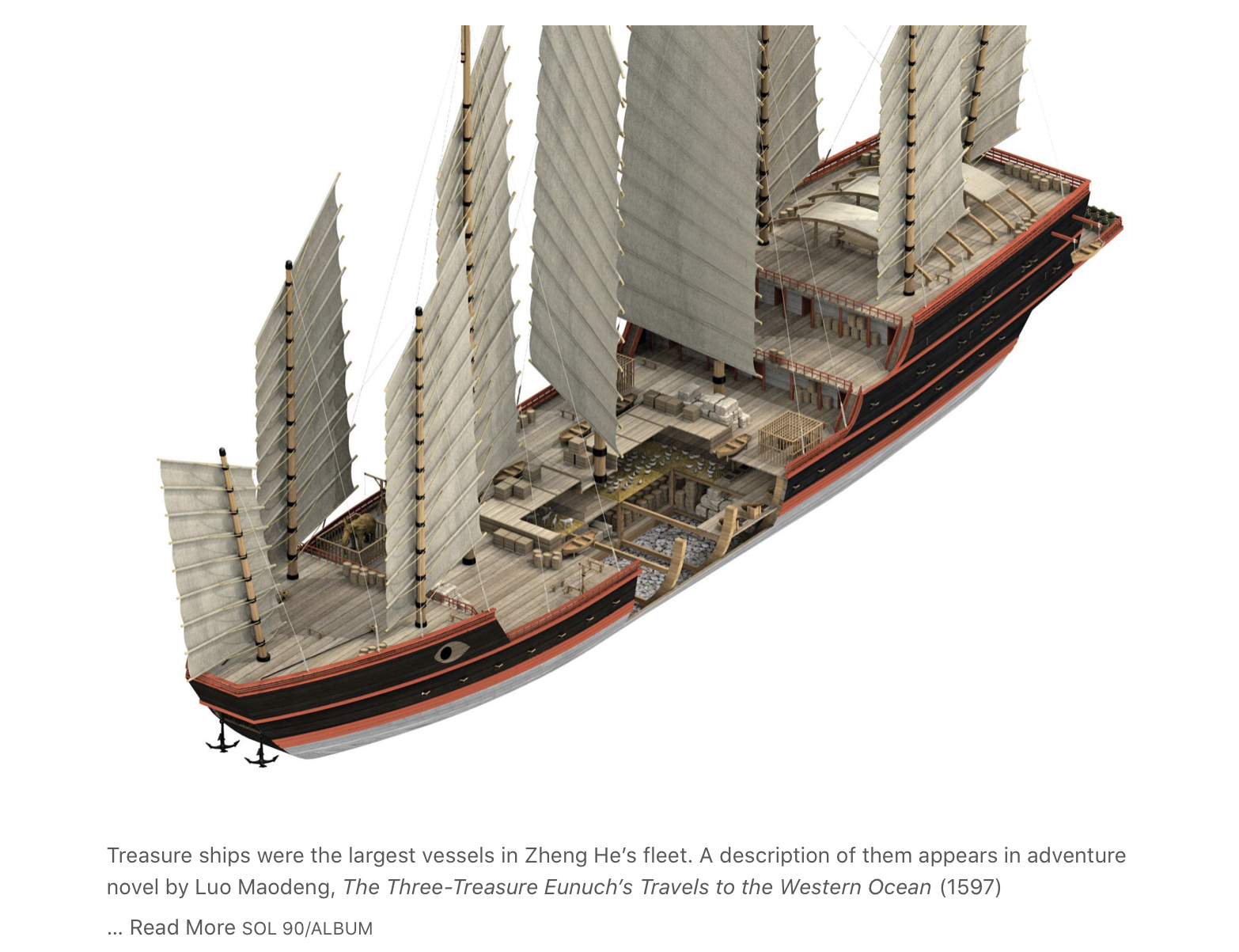 Treasure ships were the largest vessels in Zheng He’s fleet. A description of them appears in adventure novel by Luo Maodeng, The Three-Treasure Eunuch’s Travels to the Western Ocean (1597)