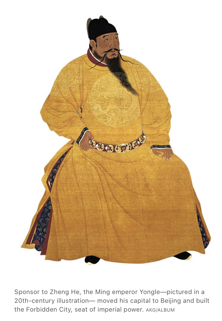Many young boys taken from the province were ritually castrated and then brought to serve in the court of Zhu Di, the future Ming emperor or Yongle. Over the next decade, Ma He would distinguish himself in the prince’s service and rise to become one of his most trusted advisers. Skilled in the arts of war, strategy, and diplomacy, the young man cut an imposing figure: Some described him as seven feet tall with a deep, booming voice. Ma He burnished his reputation as a military commander with his feats at the battle of Zhenglunba, near Beijing. After Zhu Di became the Yongle emperor in 1402, Ma He was renamed Zheng He in honor of that battle. He continued to serve alongside the emperor and became the commander of China’s most important asset: its great naval fleet, which he would command seven times.