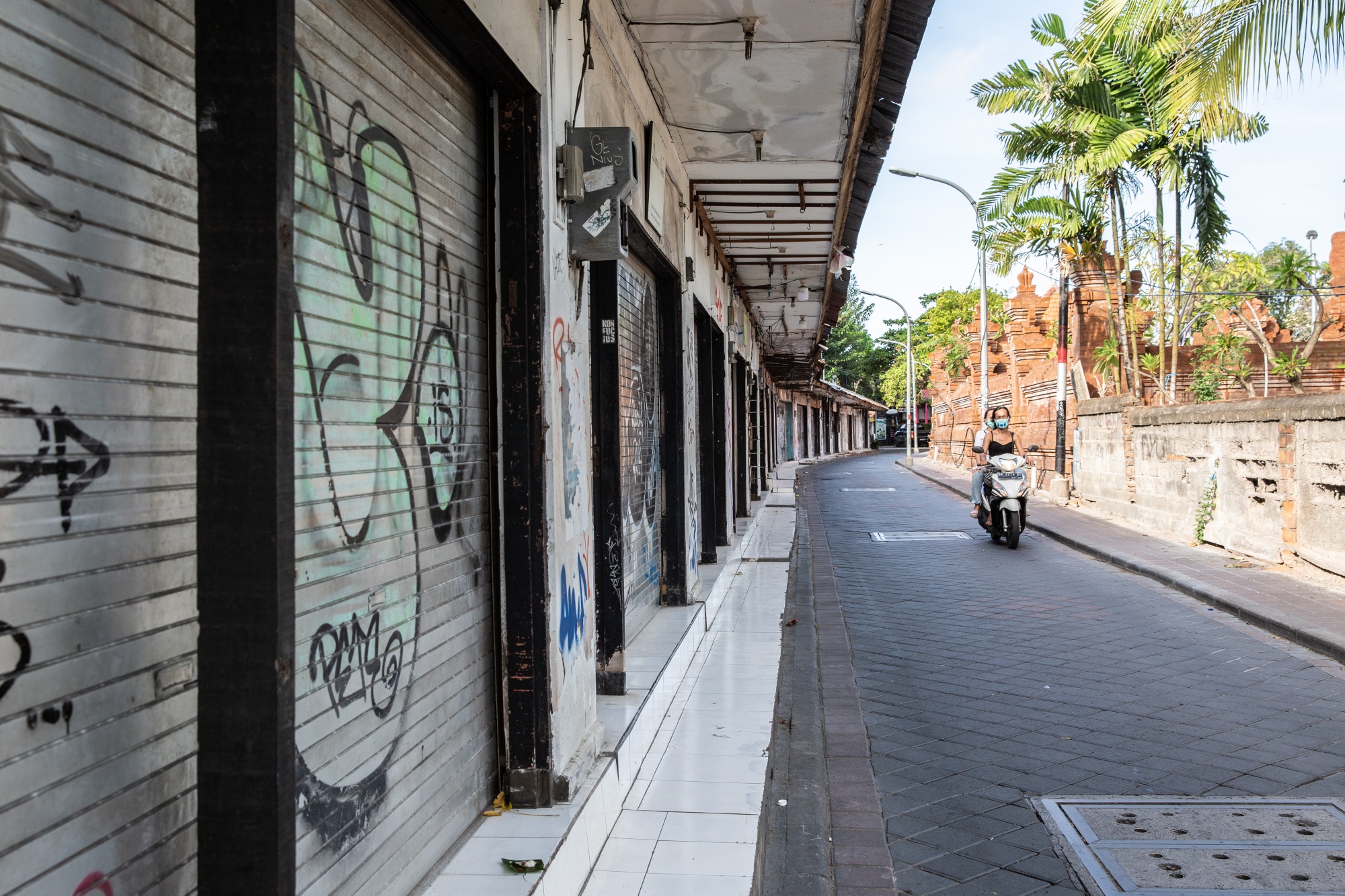 Motorcyclists ride past closed souvenir shops in Kuta.