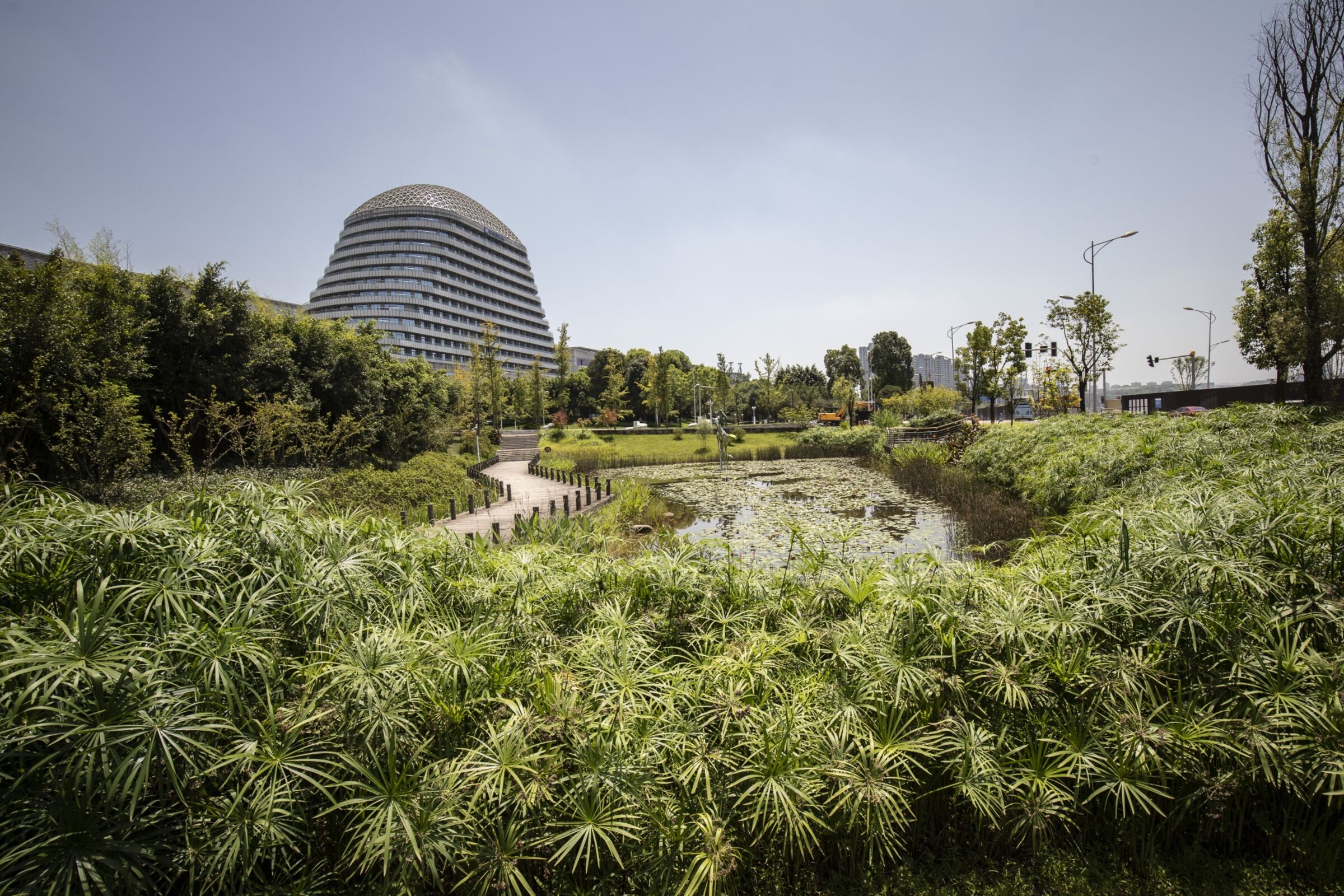 Water catchment ponds in Yuelai New Town. Photographer: Qilai Shen/Bloomberg The “sponge city” initiative, launched in 2015, is an attempt to reverse that — soak up heavy precipitation and release it slowly into the river and reservoirs. Using features such as rooftop gardens, scenic wetland parks, permeable pavements and underground storage tanks, the plan is to eventually absorb or reuse 70% of the rainwater that falls on four-fifths of China's urban land.