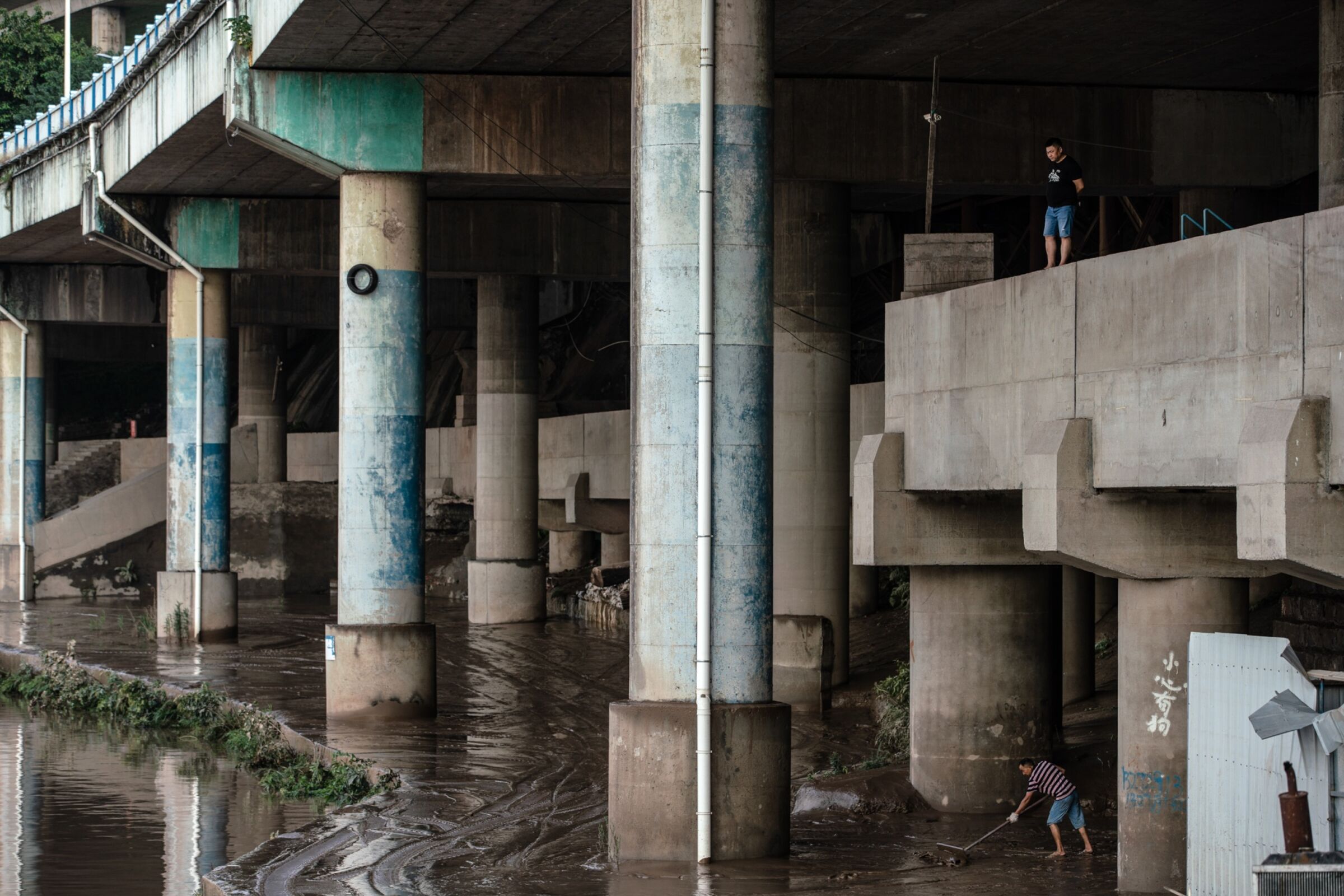 In Chongqing’s ramshackle neighborhood of Old Street, down by the Yangtze River, shopkeeper Liu cleans up the mess from last month’s floods. She lines up dozens of pairs of sodden, mud-caked shoes on the pavement outside, appealing hopefully to a passer-by, “I will sell at any price.”