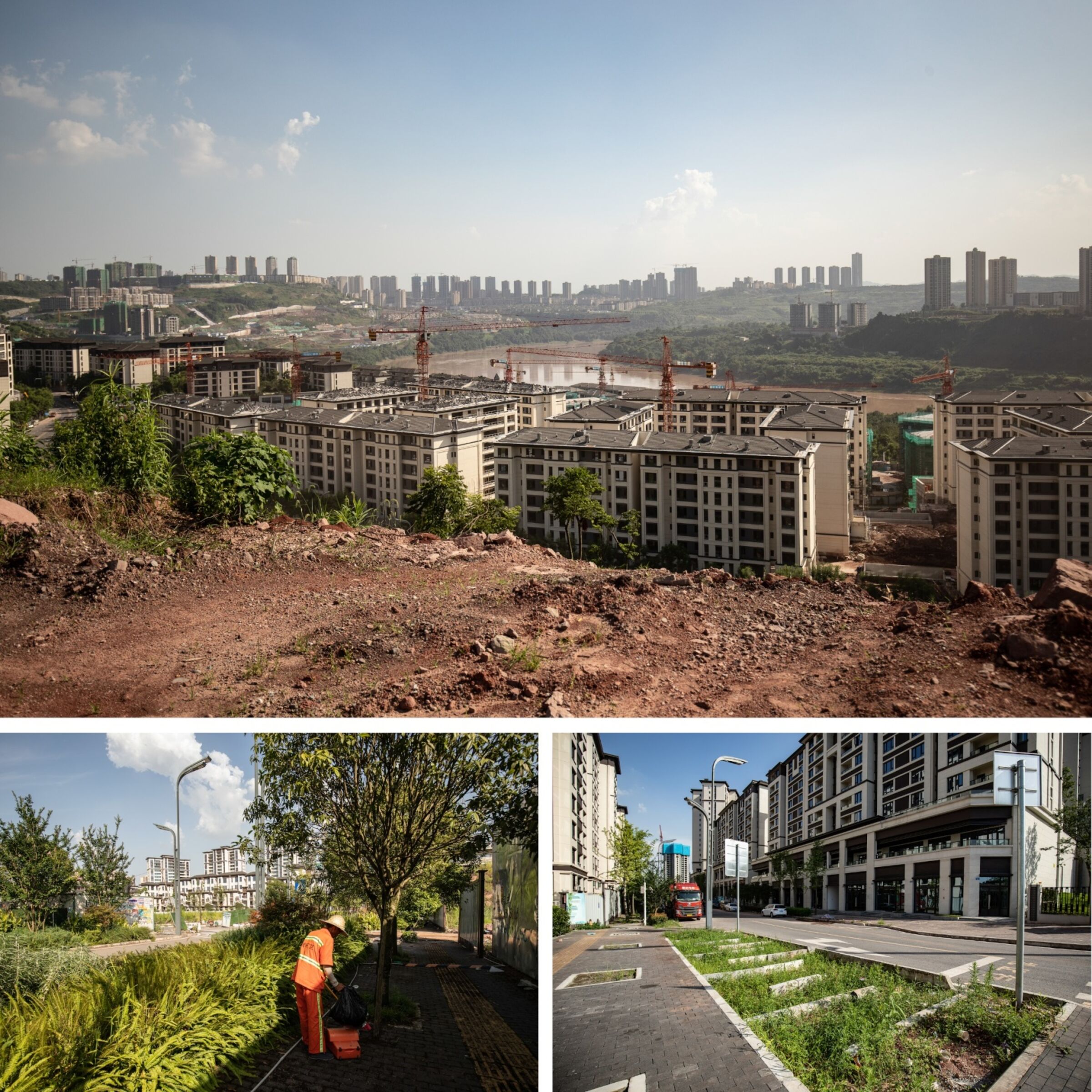 Top: New constructions spring up around Yuelai New Town. Bottom: Water retention areas on both sides of Yueju road. Photographer: Qilai Shen/Bloomberg “The developers cut down the forest and destroy the grass, build houses, and then plant decorative trees so it becomes a ‘sponge city’ and they make a bunch of money,” said Zuo, a taxi driver in Chongqing who also would only give his family name.