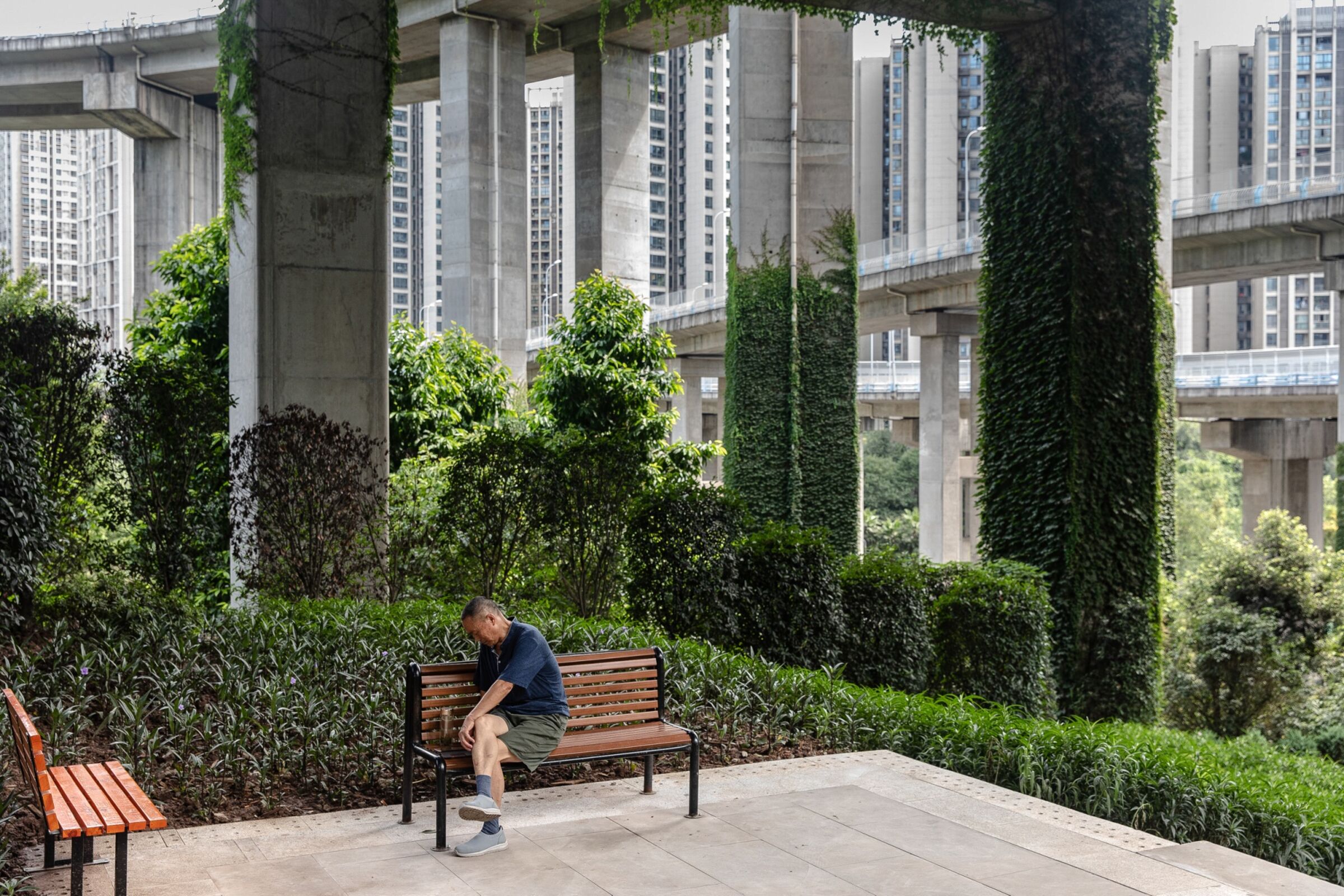 A man rests at Egongyan Park, located under an elevated highway interchange in Chongqing. Photographer: Qilai Shen/Bloomberg Yet China’s sponge city initiative is a sign that the tide in China is turning and that development at all costs is becoming less acceptable to the nation’s citizens.