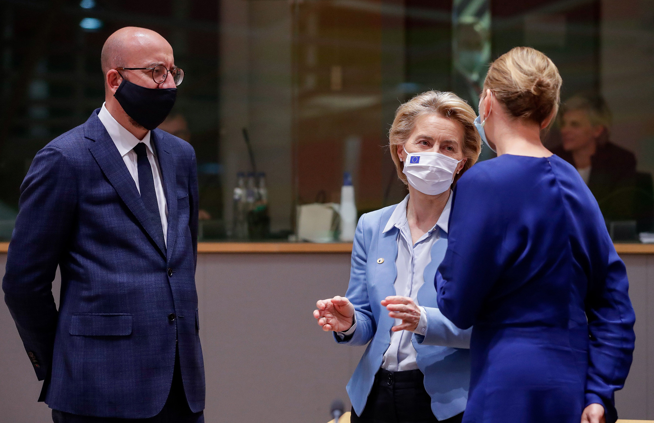 From left, Charles Michel, Ursula von der Leyen and Mette Frederiksen in Brussels on July 21.